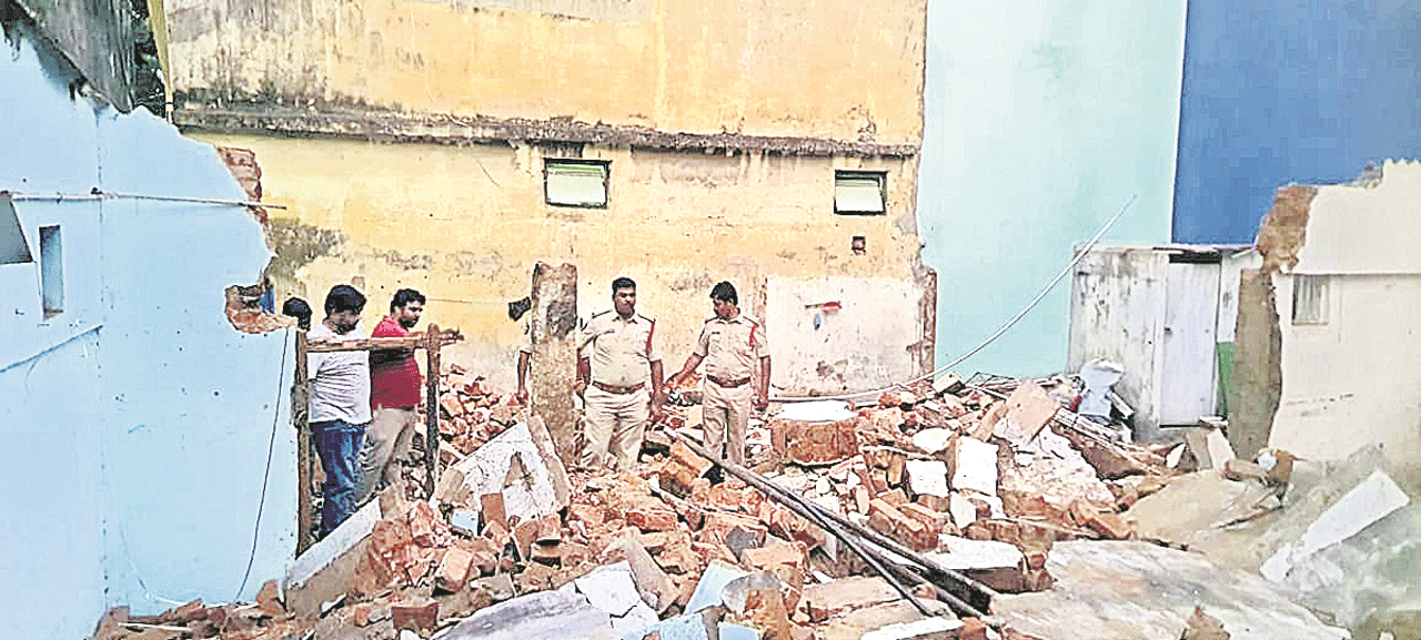 గోడ కూలడంతో శిథిలాల కిందపడి ఇద్దరు కూలీలు దుర్మరణం చెందారు.
