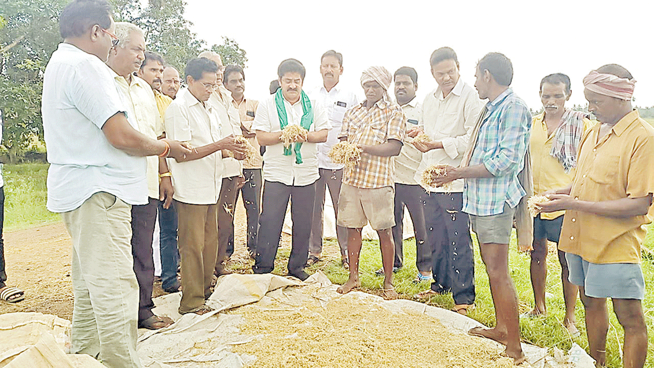 అనపర్తి/బిక్కవోలు, మే 5: ఎక్కడ చూసినా మొలకెత్తిన ధాన్యం రాశులే దర్శనమిస్తున్నాయి. మొలకెత్తిన ధాన్యాన్ని చూసి రైతు కన్నీరుమున్నీరవుతు న్నాడు. రెండు రోజులుగా భానుడు కరుణించడంతో వారం రోజులుగా బరకాల మాటున ఉన్న ధాన్యాన్ని ఒక్కొక్కటిగా తెరుస్తు వస్తున్నారు. అయితే అప్పటికే ధాన్యం మొలకెత్తి ఉండడంతో ఏం చేయాలో తెలియని పరిస్థితుల్లో రైతు కొట్టుమిట్టాడుతున్నాడు. ఇంకా అనేక చోట్ల కోత లు పూర్తి కాకపోవడంతో వరి పనలు నీటిలోనే తేలియాడుతున్నాయి. రంగు మారిన ధాన్యం కొనుగోలు చేసేందుకే ఎవరూ ముందుకు రాని ప్రస్తుత తరుణంలో మొలకెత్తిన ధాన్యం ఏం చేయాలో పాలు పోవడం లేదంటూ రైతులు ఆందోళన చెందుతున్నారు. కాగా పంట పొలాలు ధాన్యం వర్షానికి దెబ్బతిన్న ప్రాంతాల్లో పలువురు రాజ కీయ నాయకులు పర్యటిస్తున్నారు. కష్టాల్లో ఉన్న రైతులను పరామర్శిస్తు న్నారు. బాధిత రైతులను ఆదుకోవాలంటూ ప్రభుత్వాన్ని కోరుతున్నారు. శుక్రవారం అనపర్తి మండలం కుతుకులూరు, బిక్కవోలు మండలం బలభద్రపురంలో టీడీపీ రాష్ట్ర ఉపాధ్య క్షుడు నల్లమిల్లి రామకృష్ణారెడ్డి తన బృందంతో కలిసి పరిశీలించారు. ఈ సందర్భంగా రైతులు మొలకలు వచ్చిన ధాన్యాన్ని వారికి చూపుతూ తమ బాధలను చెప్పుకున్నారు. ఇప్పటి వరకు ఎవరూ తమను పరామర్శించిన పాపాన పోలేదని వాపోయారు. రామకృష్ణారెడ్డి మాట్లాడుతూ రైతులను ఆదుకునేందుకు ప్రభుత్వం ముందుకు రావాలని రంగు మారిన, మొలకెత్తిన ధాన్యాన్ని మద్దతు ధరకే కొనుగోలు చేయాలని కోతలు కోయని పంటకు ఎకరాకు రూ.25వేల నష్ట పరిహారం చెల్లించాలని ఆయన డిమాండ్ చేశారు. ప్రభుత్వ నిర్లక్ష్యం వల్లే రైతులు వర్షాలకు దొరికిపో వాల్సి వచ్చిందన్నారు. ముందుగానే రైతులు కోరినట్లుగా బొండాలు కొనుగో లుకు నిర్ణయం తీసుకుని ఉంటే రైతు ఇంత నష్టపోయేవాడు కాదని అన్నారు. టీడీపీ అధినేత చంద్రబాబు క్షేత్రస్థాయిలో పర్యటిస్తుండడంతో ఇప్పుడు అధికా రులు ఉరుకులు పరుగులు పెడుతున్నారన్నారు. ఇప్పటి వరకు ఒక్క ప్రజా ప్రతినిధి కూడా రైతులను పరామర్శించిన పాపాన పోలేదని, రైతుకు భరోసా కల్పించలేని నేతలు ఎందుకున్నారని ఆయన ప్రశ్నించారు. కార్యక్రమంలో జిల్లా తెలుగు రైతు అధ్యక్షుడు సిరసపల్లి నాగేశ్వరరావు, నాయకులు కొవ్వూరి శ్రీనివాసరెడ్డి, మామిడిశెట్టి శ్రీను, వెంకట సుబ్బారెడ్డి, సూర్రెడ్డి, శ్రీను, స్వామి, మల్లిడి సత్యనారాయణరెడ్డి, సత్తి దేవానందరెడ్డి పాల్గొన్నారు.