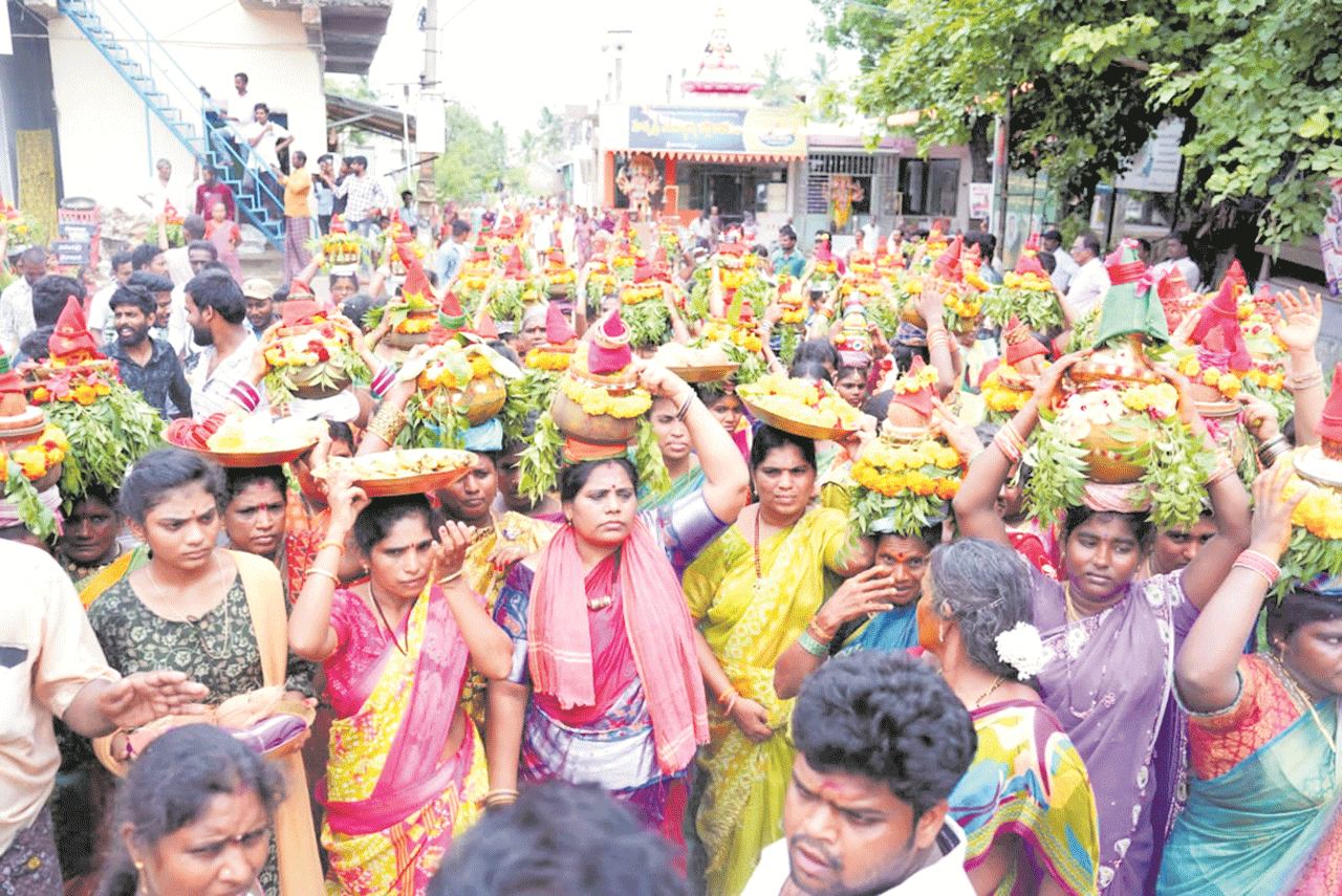 కోరుకొండ, జూలై 4 : తెలంగాణ బతుకమ్మ.. ఆంధ్రకు వచ్చింది.. కోరుకొండ మండలం శ్రీరంగపట్నంలో సందడి చేసింది.. ఆషాఢమాసం మోదకొండమ్మ బోనాల మహోత్సవాలు మంగళవారం వైభవంగా ప్రారంభమయ్యాయి. ఐదు రోజుల పాటు జరిగే ఉత్సవాల్లో భాగంగా మొదటి రోజు అమ్మవారి ఆలయం నుంచి సుమారు 1000 మందికి పైగా మహిళలు బోనాలు తలపై పెట్టుకుని గ్రామమంతా ఊరేగారు. చల్లంగ చూడమ్మా అంటూ కొలిచారు. ఆషాఢమాసంలో బోనాల ఉత్స వం తెలంగాణలో నిర్వహిస్తారు. అదే సంస్కృతిని గత 23 ఏళ్లుగా శ్రీరంగపట్నం గ్రామంలో నిర్వహించడం ఆచారం.ఈ బోనాలు ఉత్సవానికి శ్రీరంగపట్నం ఆడపడుచులు ప్రపంచంలో ఎక్కడ ఉన్న గ్రామానికి చేరుకుని బోనాలు ఎత్తుకుంటారు. బోనాలు ఎత్తుకుంటే సంతోషంగా ఉంటామని ఆడపడుచుల నమ్మకం. సుమారు 3వేల మంది వరకు మహిళలు ఈ బోనాలు ఉత్సవంలో పాల్గొనడంతో శ్రీరంగపట్నం గ్రామం ఆధ్యాత్మిక వాతావరణం సంతరించుకుంది. పలువురు ప్రముఖులు బోనాలు నెత్తిన పెట్టుకుని ఊరేగారు.