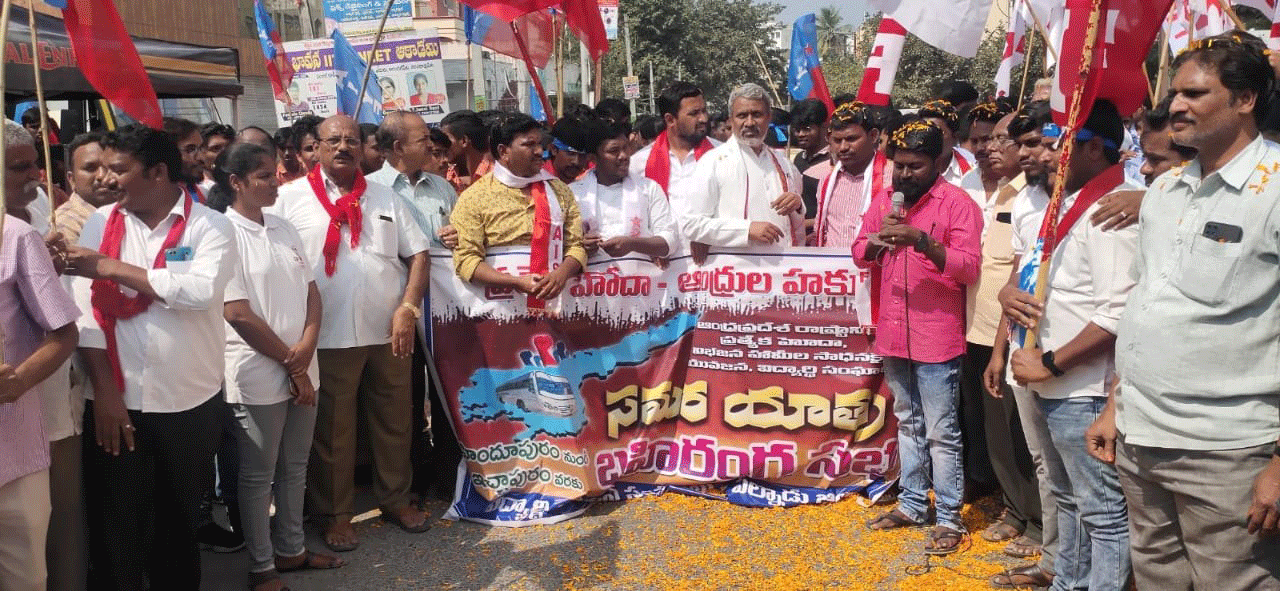 నర సరావుపేట టౌన, జనవరి 28 : తిరుపతి వెంకన్న సాక్షిగా మాట్లాడిన ప్రధాని మోదీ కేం ద్రంలో 8 ఏళ్ళు గడుస్తున్నా హోదా పై ఎక్కడా మాట్లా డకుండా, విభజన హామీలు అమలు చేయకుండా రాష్ట్ర ప్రజలను మోసం చేశారని ప్రత్యేక హోదా సాధన సమితి కన్వీనర్ చలసాని శ్రీనివాస్ అన్నారు. ప్రత్యేక హోదా, యువతకు విద్య, ఉపాధి అవకాశాల కోసం ఈ నెల 24న హిందూపురం ఉంచి ఇచ్చాపురం వరకు చేపట్టిన సమర యాత్ర ప్రచార జాత శనివారం నరసరావుపేటకు చేరుకుంది. స్థానిక బస్టాండ్ సెంటర్ నుంచి పట్టణంలోని ఏంజెల్ టాకీస్ వద్ద గల ధర్నా చౌక్ వరకు భారీ ర్యాలీ నిర్వహించారు. గడియార స్తంభం సెంటర్లో అంబేద్కర్ విగ్రహానికి పూలమాలలు వేసి నివాళులర్పించారు. సభకు డీవైఎఫ్ఐ జిల్లా కార్యదర్శి ఆంజ నేయరాజు అధ్యక్షత వహించారు. చలసాని శ్రీనివాస్ మాట్లాడుతూ యువగళం పేరుతో నారా లోకేశ చేస్తున్న పాదయాత్ర, వారాహి పేరుతో జనసేన అధ్యక్షుడు చేస్తున్న యాత్రలో ప్రత్యేక హోదా గురించి మాట్లాడాలని అన్నారు. అవసరమైతే పవన కళ్యాణ్ బీజేపీతో తెగతెంపులు చేసుకోవాలని హితవు పలికారు. కార్యక్రమంలో సీపీఎం జిల్లా కార్యదర్శి గుంటూరు విజయకుమార్, సీపీఐ జిల్లా కార్యదర్శి ఏ మారుతి వరప్రసాదు, ఏఐవైఎఫ్ రాష్ట్ర అధ్యక్షుడు జాన్సనబాబు, కార్యదర్శి లేనినబాబు, పీడీఎస్యు రాష్ట్ర అధ్యక్షుడు భాస్కర్, కార్యదర్శి గనిరాజు, ఏఐఎస్ఎఫ్ రాష్ట్ర అధ్యక్షుడు పరుచూరి రాజేంద్ర, కార్యదర్శి శివారెడ్డి, పల్నాడు జిల్లా కన్వీనర్ సుభాని, సీపీఎం నాయకుడు అనుముల లక్ష్మీశ్వరరెడ్డి, ఈపూరి మస్తానరెడ్డి, కామినేని రామారావు, సిలార్ మసూద్, మస్తాన వలి, కే సాయి, కారుచోళ నవిత, సిద్దు, రాజ్కుమార్, తదితరులు పాల్గొన్నారు.