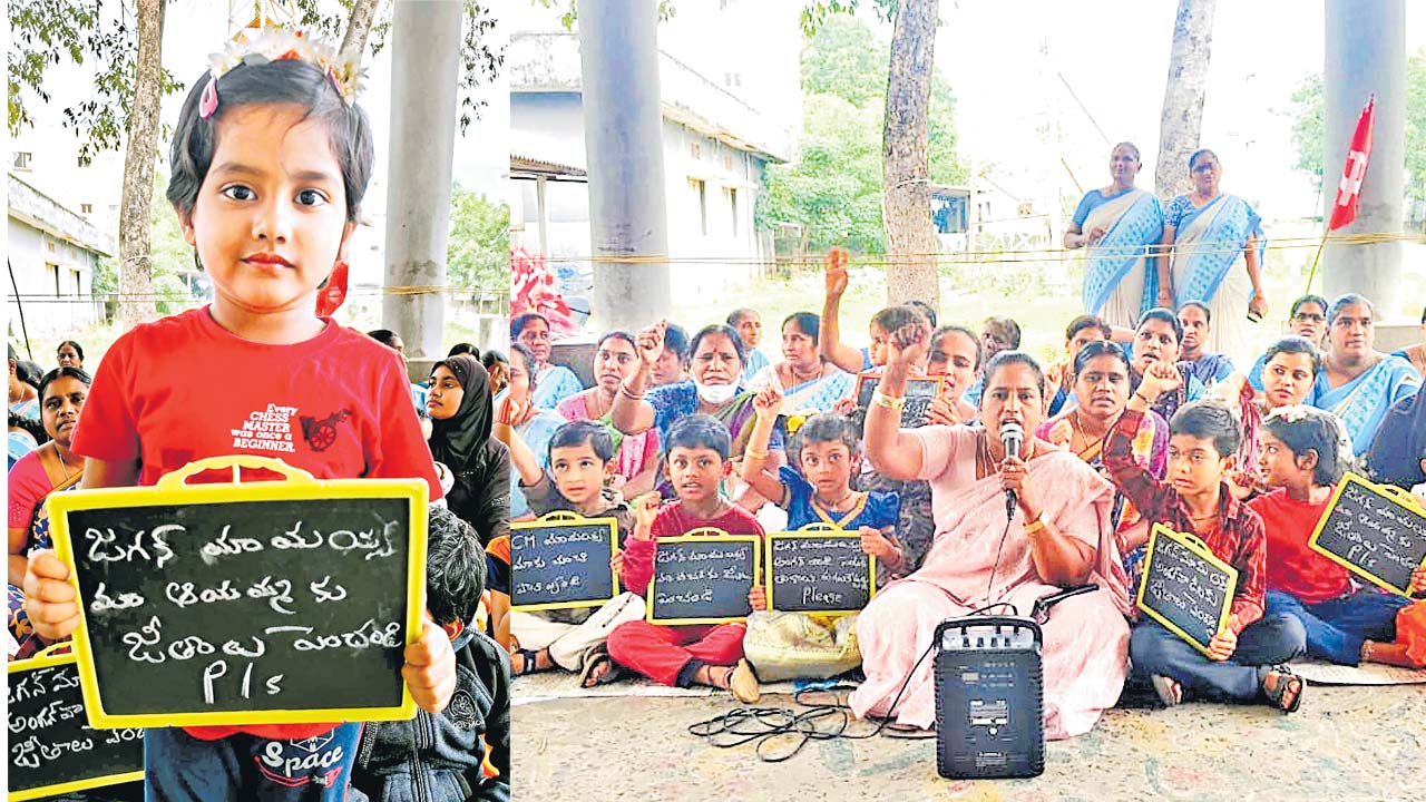 ఆయాలకు న్యాయం చేయాలి’’ అని నినదించారు. సంతమాగులూరులో పలకలపై నినాదాలు రాసి సమ్మెకు బాసటగా నిలిచారు. ఇక అద్దంకి, బాపట్లలో ఆకులు నములుతూ అంగన్వాడీ కార్యకర్తలు తమ దుస్థితిని ప్రభుత్వం దృష్టికి తీసుకెళ్లే ప్రయత్నం చేశారు. బాపట్ల జిల్లా చీరాలలోని తహసీల్దార్ కార్యాలయం వద్ద ఆదివారం అంగన్వాడీ కార్యకర్తలు చేపట్టిన నిరసనకు మద్దతుగా పలువురు చిన్నారులు, వారి తల్లులు పాల్గొన్నారు. ‘జగన్ మామయ్య మా ఆయమ్మకు జీతాలు పెంచండి’ అంటూ చిన్నారులు ప్లకార్డులు ప్రదర్శించారు. ‘మాకు మంచి పాలు ఇప్పించండి... మా టీచర్లకు జీతాలు పెంచండి’ అంటూ మైకులు పట్టుకుని అంగన్వాడీలతో కలిసి చిన్నారులు నినాదాలు చేశారు. ఇప్పటికైనా తమ న్యాయమైన డిమాండ్లను ప్రభుత్వం పరిష్కరించాలని ఈ సందర్భంగా అంగన్వాడీలు డిమాండ్ చేశారు. లేకపోతే ఉద్యమాన్ని మరింత ఉధృతం చేస్తామని హెచ్చరించారు. కార్యక్రమంలో సీఐటీయూ నాయకులు ఎన్.బాబూరావు, ఎం.వసంతరావు తదితరులు పాల్గొన్నారు.