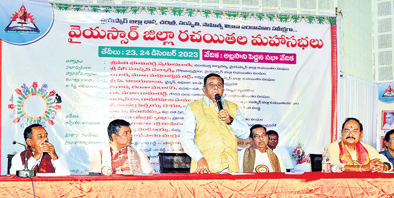 కడప (కల్చరల్), డిసెంబరు 24 : జిల్లా రచయితల సంఘం ఆధ్వర్యంలో స్థానిక కడప నగర జిల్లా పరిషత్ సభాభవనంలో రెండు రోజులుగా నిర్వహించి మహాసభలు కవి సమ్మేళనాలతో ఆదివారం ముగిశాయి. ఈ కార్యక్రమంలో ప్రముఖ కవి డాక్టర్ భూతపురి సుబ్రమణ్యశర్మ, కథా రచయిత బొమ్మిశెట్టి మోహన్ అధ్యక్షత వహించగా, ప్రముఖ కథా రచయిత దాదాహయత్ ముఖ్య అతిధిగా పాల్గొన్నారు. ఆధునిక పద్య కవిత్వం పై డాక్టర్ నరాల రామారెడ్డి, జిల్లా అవధానులు అంశంపై ఆముదాల మురళి, జిల్లా పత్రికారంగం అంశంపై తుమ్మలూరు సురే్ష్ బాబు, జిల్లా సాహిత్య విమర్శపై ఎం.విజయభాస్కర్ పత్ర సమర్పణ చేశారు. జిల్లా జానపద సాహిత్యంపై ఆచార్య సిగిచర్ల కృష్ణారెడ్డి, జిల్లా నాటకసాహిత్యం అంశంపై కొప్పోలు రెడ్డిశేఖర్రెడ్డి, జిల్లా ముస్లిం వాద సాహిత్యం అనే అంశంపై తవ్వా వెంకటయ్య, జిల్లా సాహిత్య దళిత సాహిత్యం అనే అంశంపై కోడూరు స్వతంత్రబాబు పత్ర సమర్పణ చేశారు. అనంతరం డాక్టర్ సీవీ సుబ్బన్న సభావేదికపై అవధానుల స్వీయానుభవాలు అనే సదస్సుకు జిల్లా రచయితల సంఘం ఉపాధ్యక్షులు గానుగపెంట హనుమంతరావు అధ్యక్షత వహించగా కేంద్ర సాహిత్య అకాడమీ పురస్కార గ్రహీత చదువుల బాబు ముఖ్యఅతిధిగా పాల్గొన్నారు. డాక్టర్ నరాల రామారెడ్డి, మేడసాని మోహన్ , ఆముదాల మురళి, లోకా జగన్నాఽథశాస్త్రి తమ అనుభవాలు పంచుకున్నారు. ఈ కార్యక్రమంలో జిల్లా రచయితల సంఘం ప్రధాన కార్యదర్శి .జింకా సుబ్రమణ్యం, లయన్స్ క్లబ్ ఆఫ్ కడప, అన్నమయ్య అధ్యక్షుడు పోతుల వెంకట్రామిరెడ్డి, జిల్లా నలుమూలల నుంచి పలువురు కవులు హాజరయ్యారు. జిల్లా రచయితల సంఘం గౌరవాధ్యక్షుడు షేక్ హుసేన్ సత్యాగ్నితో పాటు ప్రముఖ ఆడిటర్ లయన్ పి.ఖాసింఖాన్లు పాల్గొన్నారు. చివరగా జిల్లా రచయితల సంఘం అధ్యక్షుడు ఆచార్య మూలమల్లికార్జునరెడ్డి సమాపన ప్రసంగంచేశారు.