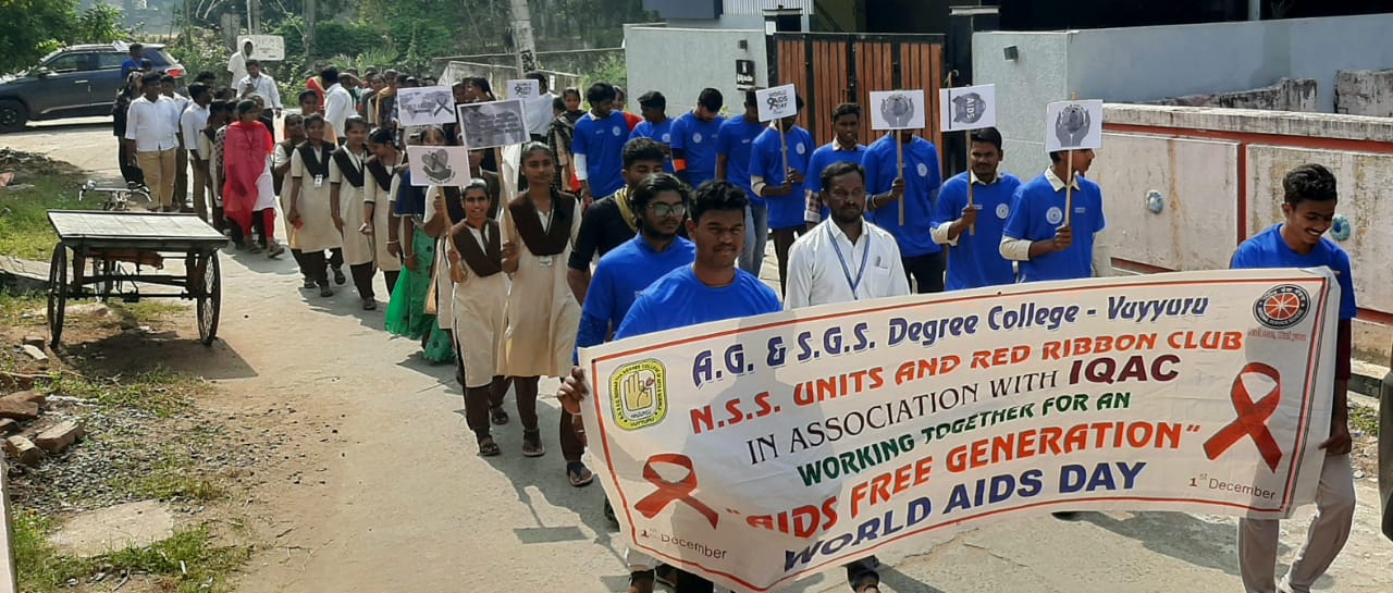 ప్రపంచ ఎయిడ్స్ దినోత్సవం పురస్కరించుకుని ఏజీ అండ్ ఎస్జీఎస్ డిగ్రీ కళాశాల ఎన్ఎస్ఎస్ యూనిట్లు, రెడ్ రిబ్బన్క్లబ్ ఆధ్వర్యంలో శుక్రవారం భారీ ర్యాలీ నిర్వహించారు. కళాశాల వద్ద ప్రిన్సిపాల్ వి.శ్రీరామ్ ర్యాలీకి జెండా ఊపి ప్రారంభించారు.
