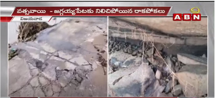 ఎన్టీఆర్ జిల్లా: భారీ వర్షాల కారణంగా తెలుగు రాష్ట్రాల్లో నదులు, కాలువలు, వాగులు, వంకలు పొంగిపొర్లుతున్నాయి. ప్రస్తుతం వానలు తగ్గుముఖం పట్టినా ప్రవాహం ఏ మాత్రం తగ్గలేదు. దీంతో విజయవాడ-హైదరాబాద్ రహదారిపై రాకపోకలకు తీవ్ర అంతరాయం ఏర్పడింది. రెండు, మూడు రోజులుగా భారీ ఎత్తున వాహనాలు నిలిచిపోయాయి. ప్రవాహం తగ్గుతుందేమోనని ఆశించారు గానీ ప్రస్తుతం ఆ పరిస్థితులు కనిపించడం లేదు. పైగా భారీ వరదల కారణంగా మున్నేరు బ్రిడ్జి పూర్తిగా దెబ్బతింది. దీంతో వత్సవాయి మండలం పరిధిలోని లింగాల గ్రామం దగ్గర ఉన్న మున్నేరు బ్రిడ్జిని అధికారులు మూసివేశారు. మరోవైపు వత్సవాయి-జగ్గయ్యపేట రూట్లో రాకపోకలు నిలిచిపోయాయి. వత్సవాయి మండలంలోకి వెళ్లేందుకు పెనుగంచిప్రోలు మండలం మీదగా వెళ్లాలని అధికారులు సూచిస్తున్నారు.