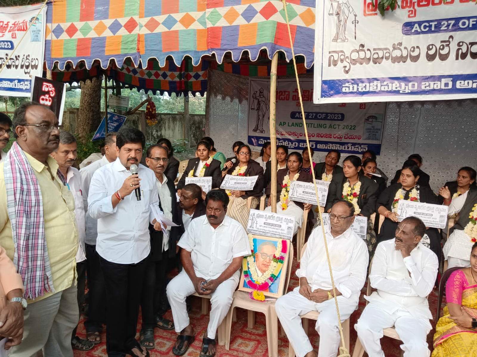 మచిలీపట్నం టౌన్, డిసెంబరు 21 : ప్రజల హక్కులను హరించే ఏపీ భూయాజమాన్య హక్కు చట్టాన్ని తక్షణమే ఉపసంహరించాలని మాజీ మంత్రి కొల్లు రవీంద్ర డిమాండ్ చేశారు. మహిళా న్యాయవాదులు చేస్తున్న రిలే నిరాహార దీక్షా శిబిరాన్ని కొల్లు రవీంద్ర గురువారం సందర్శించి సంఘీభావం తెలిపారు. కొల్లు రవీంద్ర మాట్లాడుతూ, సివిల్ కోర్టు పరిధిని తగ్గిస్తూ ప్రజల భూమి యాజమాన్యాన్ని నిర్ణయించే హక్కు ప్రభుత్వ అధికారికి అప్పగించడం వల్ల న్యాయ వ్యవస్థ పవిత్రతను కోల్పోతుందన్నారు. మచిలీపట్నం న్యాయవాదుల సంఘం అధ్యక్షుడు తుంగల హరిబాబు అధ్యక్షతన జరిగిన నిరసనలో కార్యదర్శి కొట్టె రఘురామ్, న్యాయవాది రజియా సుల్తానా, టీడీపీ నాయకులు గొర్రెపాటి గోపీచంద్, పల్లపాటి సుబ్రహ్మణ్యం, లంకే హరికృష్ణ, లంకిశెట్టి నీరజ, పి.వి ఫణికుమార్, ఎండి ఇలియాస్ పాషా, పిప్పళ్ళ కాంతారావు, వక్కపట్ల శ్రీను, కుంచే నాని, పుప్పాల ప్రసాద్, కరెడ్ల సుశీల, ఆళ్ళ మాధవ, కార్పొరేటర్ దేవరపల్లి అనిత పాల్గొన్నారు.