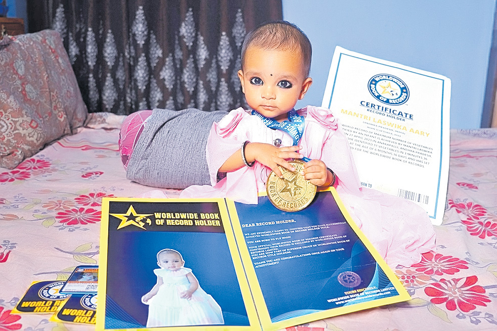 అనకాపల్లి రూరల్, జూన్ 13: పిట్ట కొంచెం కూత ఘనం అన్నట్టు... ఆ చిన్నారి ఆరు నెలల వయసులోనే వండర్ కిడ్గా గుర్తింపు పొందింది. అనకాపల్లికి చెందిన ఆరు నెలల చిన్నారి తన అపారమైన జ్ఞాపకశక్తితో వరల్డ్వైడ్ బుక్ ఆఫ్ రికార్డ్స్, ఇంటర్నేషనల్ బుక్ ఆఫ్ రికార్డ్స్లో చోటు సంపాదించింది. అనకాపల్లి మండలం రేబాక గ్రామానికి చెందిన మంత్రి వెంకటనారాయణమూర్తి, తేజస్విని దంపతుల కుమార్తె లాస్విక ఆర్యకు ప్రస్తుతం తొమ్మిది నెలల వయసు. ఈ చిన్నారికి ఆరు నెలల వయసున్నప్పుడు తల్లి తేజస్విని పలురకాల కూరగాయలు, జంతువులు బొమ్మలను చూపించి వాటిని గుర్తించడంలో శిక్షణ ఇచ్చారు.