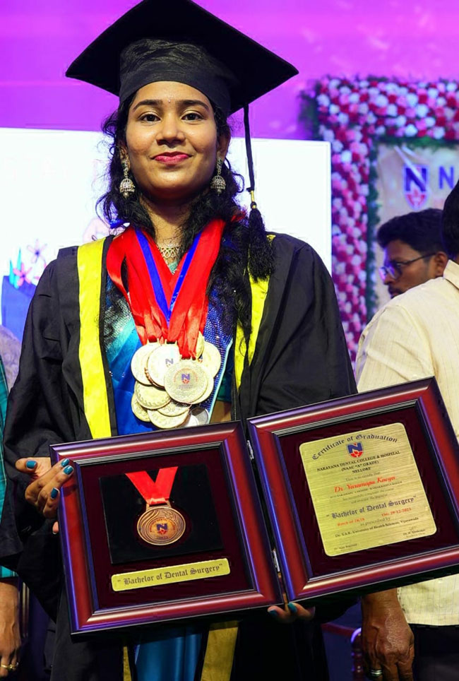 మనుబోలు, డిసెంబరు 31: మనుబోలుకి చెందిన దంత వైద్యురాలు డాక్టర్ కావ్య నెల్లూరు నారాయణ మెడికల్ కళాశాలలో జరిగిన గ్రాడ్యుయేషన్ వేడుకలో 20 అవార్డులు అందుకున్నారు. ఆమె 2018లో బీడీఎస్లో చేరారు. 3వ ఏడాది పబ్లిక్ హెల్త్ డెంటిస్టరీ విభాగంలో స్టేట్పస్ట్ అవార్డు, నాలుగవ ఏడాదిలో స్టేట్లో 9వ స్థానంలో అవార్డు, జిల్లా స్థాయిలో నాలుగు విభాగాల్లో 16అవార్డులతోపాటు, వ్యక్తిగత ప్రవర్తనలో బెస్ట్ అవుట్గోయింగ్ అవార్డును, వైద్యురాలిగా పట్టాను డెంటల్ కాలేజీ ప్రిన్సిపాల్ అజయ్వెజనాల్, డీన్ శివకుమార్, హెచ్వోడీ లావ్యణ అనుమోలా, మెడికల్ కళాశాల ప్రిన్సిపాల్ శ్రీనువాసులు తదితరుల నుంచి అందుకున్నారు. ఈ సందర్భంగా ఆమెను పలువురు అభినందించారు.