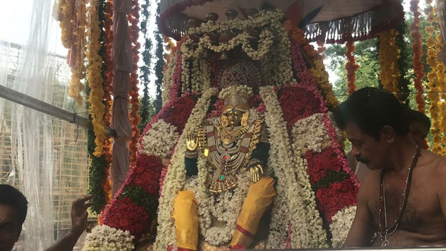 వెంకటాచలం, ఆగష్టు 21 : గొలగమూడిలో జరుగుతున్న ఆరాధనోత్సవాల్లో భాగంగా సోమవారం వెంకయ్యస్వామికి చినశేష, గజవాహన సేవలు జరిగాయి. వేకువజామున గోపూజతోనిత్య పూజలు మొదలయ్యాయి. అనంతరం సుప్రభాత సేవ, అభిషేకము, పూజ, హారతి, ప్రసాద వినియోగము, ఉత్సవ విగ్రహానికి అభిషేకము, సహస్రనామార్చనలు జరిగాయి. ఉదయం 10 గంటలకు ఆశ్రమ ఈవో బాలసుబ్రహ్మణ్యం ఆధ్వర్యంలో చినశేష వాహనసేవ నిర్వహించారు. రాత్రికి గజవాహన సేవ నేత్ర పర్వంగా జరిగింది. సేవలను తిలకించడానికి భక్తులు తండోపతండాలుగా వచ్చారు. ఊరేగింపు ముందు ఏర్పాటు చేసిన పలు రకాల వాయిద్యాలు భక్తులను ఉత్సాహపరిచాయి. వెంకయ్య స్వామివారికి కర్పూర నీరాజనాలు అందించి తీర్థ ప్రసాదాలు స్వీకరించారు.