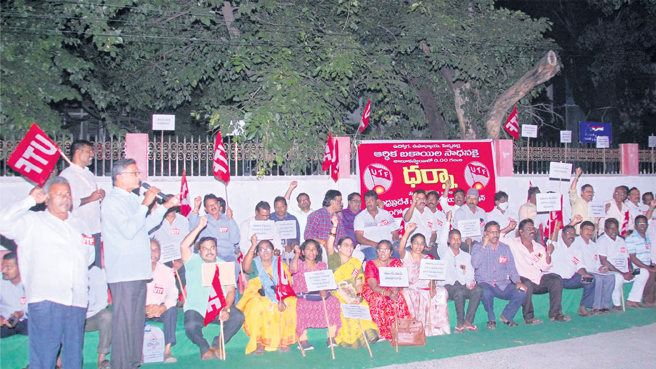 ఒంగోలు (విద్య), డిసెంబరు 27 : ప్రభుత్వం బకాయిలను వెంటనే విడుదల చేయాలని డిమాండ్ చేస్తూ ఉపాధ్యాయులు రోడ్డెక్కారు. ఆంధ్రప్రదేశ్ ఐక్య ఉపాధ్యాయ ఫెడరేషన్ (యూటీఎఫ్) రాష్ట్ర కమిటీ పిలుపుమేరకు బుధవారం సాయంత్రం జిల్లాలోని తాలూకా, మండల కేంద్రాల్లో ఆందోళనలు నిర్వహించారు. ప్రభుత్వం నుంచి రావాల్సిన పీఆర్సీ, డీఏ బకాయిలు, సరెండర్ లీవులు, పీఎఫ్, ఏపీజీఎల్ఐ రుణాలను వెంటనే విడుదల చేయాలని డిమాండ్ చేశారు. కలెక్టరేట్ వద్ద నిర్వహించిన ధర్నాలో యూనియన్ రాష్ట్ర గౌరవాధ్యక్షుడు కె.శ్రీనివాసరావు మాట్లాడుతూ పీఆర్సీ, రెండు డీఏల బకాయిలు సుమారు రూ.12వేల కోట్లు, సరెండర్ లీవు బకాయిలకు సంబంధించి రూ.4500 కోట్లు ఉన్నా ఇంతవరకు ప్రభుత్వం చెల్లించలేదని మండిపడ్డారు. పీఎఫ్, ఏపీజీఎల్ఐ లోన్లు, పార్ట్ ఫైనల్ బకాయిలు మరో రూ.1,500 కోట్లు ఉందన్నారు. గత ఆగస్టులో జరిగిన జాయింట్ స్టాఫ్ కౌన్సిల్లో అన్నిరకాల బకాయిలు సెప్టెంబరులో చెల్లిస్తామన్న ప్రభుత్వం ఇంతవరకూ ఇచ్చిన పరిస్థితి లేకుండాపోయిందన్నారు. ఎస్.రవి అధ్యక్షతన జరిగిన ధర్నాలో యూటీఎఫ్ జిల్లా ప్రధాన కార్యదర్శి వీరాంజనేయులు, జి.ఉమామహేశ్వరి, చిన్నస్వామి, బాలరాజు, వెంకయ్య, ఝాన్సీ, ఎస్వి కొండారెడ్డి తదితరులు పాల్గొన్నారు.