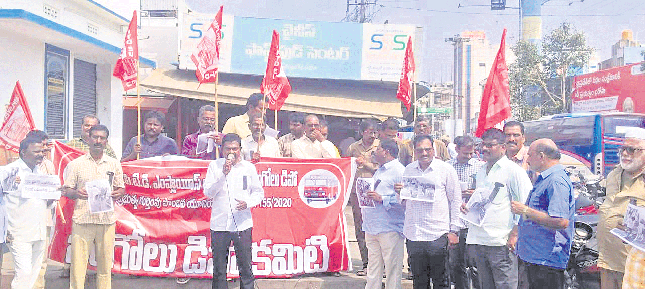 విధుల్లో ఉన్న ఆర్టీసీ డ్రైవర్పై వైసీపీ నాయకులు దాడి దారుణమని ఎంప్లాయీస్ యూనియన్ రాష్ట్ర ఉపాధ్యక్షుడు కె.నాగేశ్వరరావు అన్నారు. హారన్ కొట్టినందుకే భౌతికదాడులకు పాల్పడటం జగన్ దౌర్జన్యపాలనకు నిదర్శనమని ధ్వజమెత్తారు. శనివారం కావలి వద్ద ఆర్టీసీ డ్రైవర్పై దాడిని నిరసిస్తూ జిల్లాలో ఈయూ ఆధ్వర్యంలో ఆదివారం కార్మికులు ఆందోళనలు చేపట్టారు.