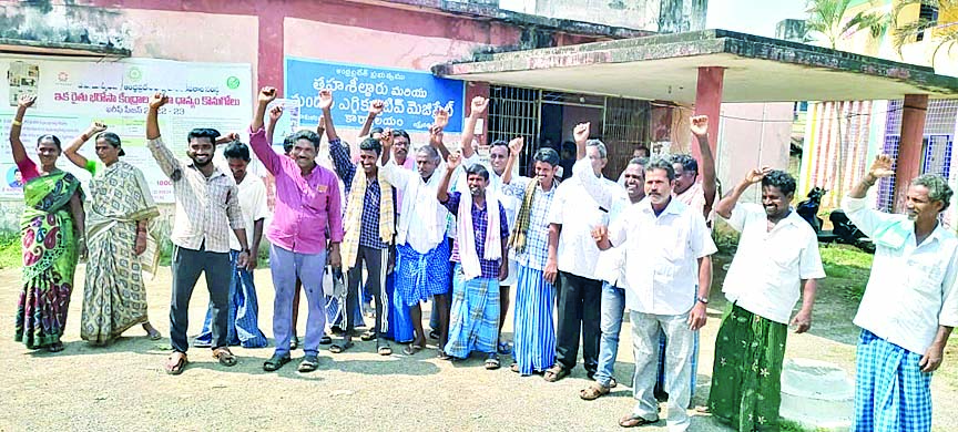 ధాన్యం కొనుగోలు చేయాలని డిమాండ్ చేస్తూ బొర్రంపేట, ముంగెన్నపాడు గ్రామాలకు చెందిన కె.భాస్కరరావు, రాధాకృష్ణలతో పాటు మరి కొందరు రైతులు మంగళవారం తహసీల్దార్ కార్యాలయం ఎదుట ధర్నా చేశారు. పంట పొలాల్లో వరి చేను కుప్పలను నూర్పులు చేసి ధాన్యం సిద్ధం చేసినా ఇంత వరకు ఆర్బీకేల ద్వారా కొనుగోలు చేయ లేదని, దీంతో ఇబ్బందులు పడుతు న్నామని ఆవేదన వ్యక్తంచేశారు.