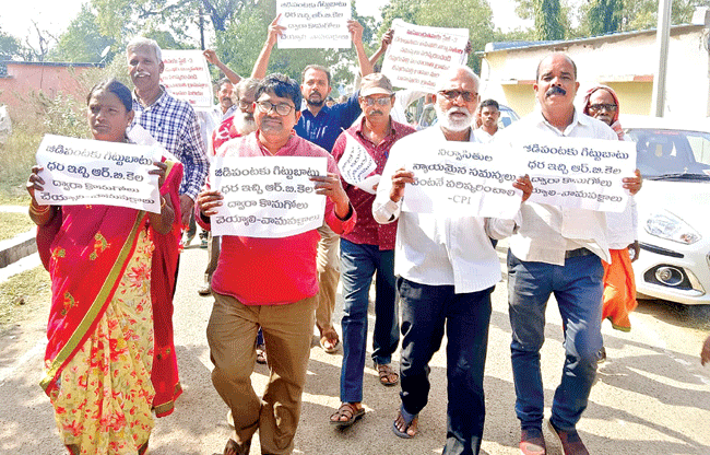 కాశీబుగ్గ: సీఎం సభలో వామపక్ష నేతలు ప్లకార్డులతో నిరసన తెలిపారు. ‘సిక్కోలును కరువు జిల్లాగా ప్రకటించాలి. జీడిపంటకు గిట్టుబాటు ధర కల్పిం చాలి. సాగునీటి ప్రాజెక్టులు పూర్తిచేయాలి. వంశధార కాలువను ఆధుని కీకరించి ఇచ్ఛాపురం వరకు పొడిగించాల’ని డిమాండ్ చేశారు. ‘వంశధారను ఆధునికీకరిస్తే రెండు లక్షల ఎకరాలకు సాగునీరందుతుంది. వలసల నివారణ సాధ్యమవుతుంది. 80 కేజీల జీడిబస్తాకు రూ.16వేలు చొప్పున మద్దతు ధర ప్రకటించాలి. ఆర్బీకేల ద్వారా జీడిపంట కొనుగోలు చేయాల’ని వారు కోరారు. కార్యక్రమంలో సీపీఐ, సీపీఎం నాయకులు చాపర వెంకటరమణ,ీ మోహన్రావు, చాపర వేణుగోపాల్, మాధవరావు, రామారావు, వాసు, శ్రీనివాస్, భాస్కరావు, భానుమతి పాల్గొన్నారు.