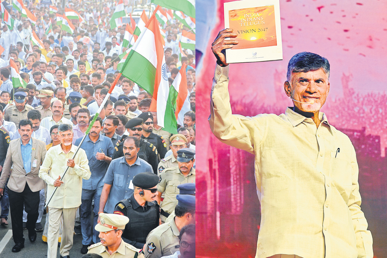 విశాఖలో చంద్రబాబు పాదయాత్రకు నగర వాసులు బ్రహ్మరథం పట్టారు. మంగళవారం సాయంత్రం నగరంలోని ఆర్కే బీచ్ రోడ్డులో ఆయన చేపట్టిన పాదయాత్రలో వేల మంది పాల్గొన్నారు. ‘జై చంద్రబాబు’, ‘జైజై చంద్రబాబు’, ‘సీఎం సీబీఎన్’ అనే నినాదాలతో హోరెత్తించారు. ‘విజన్-2047’ డాక్యుమెంట్ను విడుదల చేసేందుకు ఆయన మంగళవారం సాయంత్రం విశాఖ వచ్చారు. విమానాశ్రయం నుంచి నేరుగా ఆర్కే బీచ్ రోడ్డులోని ఎన్టీఆర్ విగ్రహం వద్దకు చేరుకున్నారు. ముందుగా జాతిపిత గాంధీజీ చిత్రపటానికి, అనంతరం ఎన్టీఆర్ విగ్రహానికి పూలమాల వేసి నివాళులర్పించారు. తర్వాత 5.31 గంటలకు భారీ జాతీయ పతాకం చేబూని పాదయాత్ర ప్రారంభించారు. అప్పటికే బీచ్ రోడ్డుకు వేలాదిగా చేరుకున్న యువతీయువకులు, విద్యార్థులు, న్యాయవాదులు, వివిధ వర్గాలు, రంగాలకు చెందిన ప్రముఖులు, రైతులు, నగర వాసులు, తెలుగుదేశం అభిమానులు ఆయన వెంట నడిచారు.