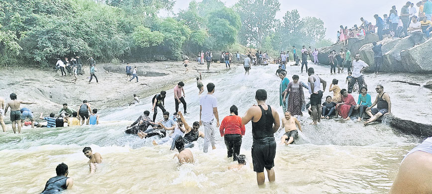 డుంబ్రిగుడ: మండలంలోని పర్యాటక కేంద్రాలు పర్యాటకులతో కిటకిటలాడాయి. మండల కేంద్రంలోని చాపరాయి జలవిహారికి పర్యాటకులు పోటెత్తారు. జలవిహారిలో స్నానాలు చేసి సందడిగా గడిపారు. జలపాతంలో గిరిజన మహిళలు ప్రదర్శించిన థింసా నృత్యాలను ఆస్వాదించారు. జైపూర్ జంక్షన్ నుంచి చాపరాయి జలపాతంలోని జాతీయ రహదారికి ఇరువైపులా బంతిపూలు, పొద్దు తిరుగుడు పూల తోటల్లో పర్యాటకులు ఫొటోలు తీసుకున్నారు. అంజోడ సిల్క్ఫాం, కొల్లాపుట్టు జలతరంగిణిని అధిక సంఖ్యలో సందర్శించారు. కార్తీక మాసం కావడంతో రెండు వారాలుగా పర్యాటక కేంద్రాలు కిటకిటలాడుతున్నాయి.