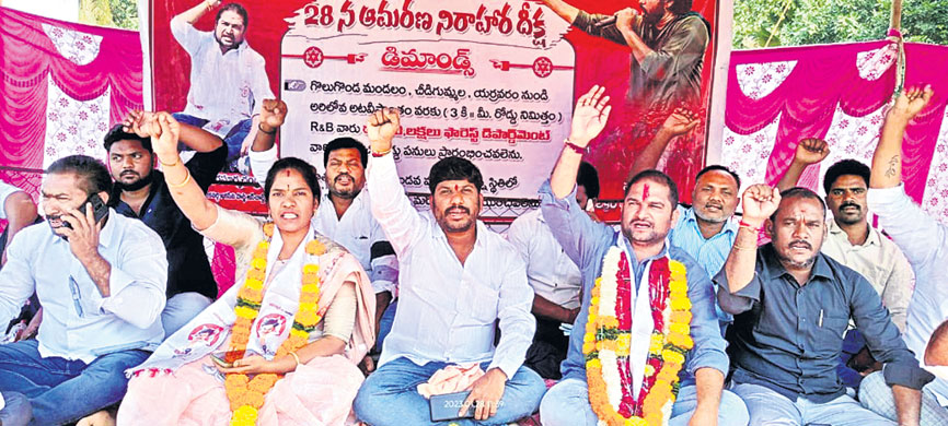 గొలుగొండ మండలం చీడిగుమ్మల, యర్రవరం నుంచి అరిలోవ అటవీ ప్రాంతం వరకు 3 కిలోమీటర్ల రోడ్డు నిర్మాణం చేపట్టాలని డిమాండ్ చేస్తూ శనివారం ఆర్డీఓ కార్యాలయం ఎదుట జనసేన నియోజకవర్గ ఇన్చార్జి వీర సూర్యచంద్ర ఆమరణ నిరాహార దీక్షను ప్రారంభిం చారు
