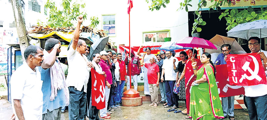 అనకాపల్లిటౌన్, మే 1: జిల్లాలో కార్మిక దినోత్సవాన్ని సోమవారం ఘనంగా నిర్వహించారు. వర్షం కురుస్తున్నా పరిశ్రమలు, ఆటో కార్మికులు సంబరాలు జరుపుకున్నారు. అనకాపల్లి పట్టణంలోని సీఐటీయూ కార్యాలయం వద్ద కౌలురైతుల సంఘం జిల్లా కార్యదర్శి ఎ.బాలకృష్ణ అరుణ పతాకాన్ని ఎగురవేశారు. సీఐటీయూ జిల్లా అధ్యక్షుడు రుత్తల శంకరరావు ఆధ్వర్యంలో ఏపీ బేవరేజస్ వద్ద కె.కొండలరావు, బైపాస్రోడ్డులో ముఠా కార్మికుల ఆధ్వర్యంలో మంద రాము, బాటా సెంటర్ వద్ద భీశెట్టి అప్పారావు, జీవీఎంసీ జోనల్ కార్యాలయం వద్ద బొమ్మల రాము, వ్యవసాయ పరిశోధనా కేంద్రం వద్ద కొణతాల నందీశ్వరరావు, ఆర్టీసీ డిపో వద్ద పరమేశ్వరరావు అరుణ పతాకాలను ఎగురవేశారు. కార్యక్రమాల్లో లంకా అప్పారావు, సురేష్, లక్ష్మణ్, సత్యనారాయణ, యూటీఎఫ్ జిల్లా అధ్యక్షురాలు శ్రీలక్ష్మి, రమణమ్మ పాల్గొన్నారు.