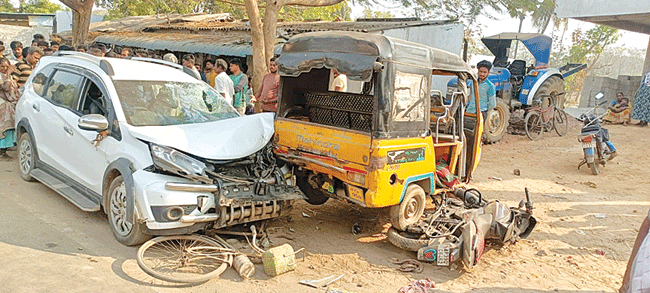 బొండపల్లి: గొట్లాం గ్రామ సమీపంలో ఓ కారు విధ్వంసం సృష్టించింది. అత్యంత వేగంతో వచ్చి, ఆగిఉన్న వాహనాలను ఢీకొట్టింది. ఈ ప్రమాదంలో ముగ్గురు తీవ్రంగా గాయపడగా, మరో ఇద్దరికి స్వల్ప గాయాలయ్యాయి. వివరా లు ఇలా ఉన్నాయి. గురువారం విజయనగరం వైపు నుంచి గజపతినగరం వైపు జాతీయరహదారిపై వేగంగా వస్తున్న ఓ కారు.. గొట్లాం గ్రామ సమీపంలోని టిఫిన్ సెంటర్ వద్ద ఆగిఉన్న ఆటో, బైకు, సైకిల్పైకి దూసుకెళ్లింది. ఈ ప్రమాదంలో సైకిల్ వద్ద నిలబడి ఉన్న కె.చంద్రరావు, ఆటోలో ఉన్న ఆటోడ్రైవర్ వి.వెంకటరమణ, అతని కూతురు వి.లికితశ్రీ తీవ్రంగా గాయపడ్డారు. అక్కడ నిలబడి ఉన్న మరో ఇద్దరికి కూడా స్వల్ప గాయాలయ్యాయి. క్షతగాత్రులను 108 వాహనంలో విజయనగరం సర్వజన కేంద్ర ఆసుపత్రికి తరలించారు. ఈ ఘటనపై పోలీసులు కేసు నమోదుచేసి దర్యాప్తు చేస్తున్నారు. కారు డ్రైవర్ వివరాలు తెలియాల్సి ఉంది.