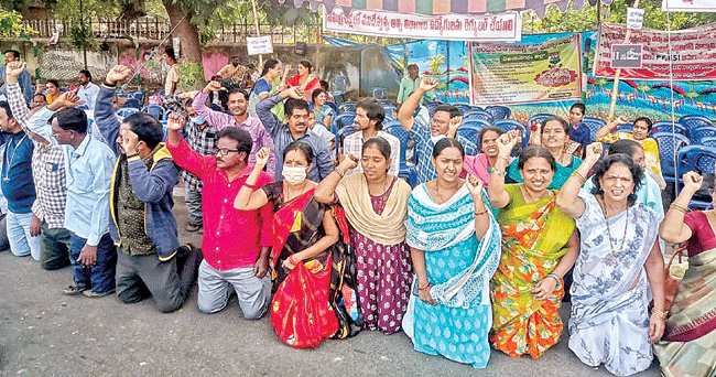 కలెక్టరేట్: తమకు ఉద్యోగ భద్రత కల్పించాలని సమగ్రశిక్షలో పనిచేస్తున్న ఔట్ సోర్సింగ్ ఉద్యోగులు కోరారు. కొద్దిరోజులు సమస్యలు పరిష్కారం కోసం కలెక్టరేట్ వద్ద సమ్మె నిర్వహిస్తున్న సమగ్ర శిక్ష ఉద్యోగులు శనివారం మోకాళ్లపైౖ నిలబడి మోకాళ్లపైౖ నిలబడి ప్రభుత్వానికి దండం పెట్టి వినూత్నంగా నిరసన తెలిపారు. వీరికి ఏపీటీఎఫ్ నాయకులు మద్దతు తెలిపారు. ఈ సందర్బంగా సంఘ నాయకులు బంకురు జోగి నాయుడు మాట్లాడుతూ మహిళా ఉద్యోగులకు చైల్డ్కేర్ లీవులు మంజూరు చేయాల న్నారు.కాగాసాయంత్రం విశాఖలో విద్యాశాఖ మంత్రి బొత్స సత్యనారాయణ ఆయా ఉద్యోగ సంఘ నాయకులతో జరిపిన చర్చలు విఫలంకావడంతో యధావిఽధిగా సమ్మె కొనసాగుతుందని యూనియన్ నాయకులు వెల్లడించారు.