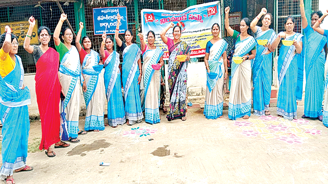 బెలగాం/సాలూరు/పాలకొండ/కురుపాం, డిసెంబరు 31: వైసీపీ ప్రభుత్వం ఇచ్చిన హామీలన్నింటినీ నెరవేర్చాలని అంగన్వాడీలు డిమాండ్ చేశారు. తమ సమస్యలు పరిష్కరించాలని నినదించారు. జిల్లాలో అంగన్వాడీలు చేపట్టిన సమ్మె 20వ రోజుకు చేరుకుంది. ఈ మేరకు ఆదివారం జిల్లావ్యాప్తంగా వారు ఆటపాటలతో నిరసన తెలిపారు. ప్రభుత్వం మొండి వైఖరి వీడాలని నినాదాలు చేశారు. పార్వతీపురం కలెక్టరేట్ వద్ద అంగన్వాడీలు స్కిప్పింగ్, బంతితో ఆటలాడుతూ నిరసన తెలిపారు. అనంతరం సర్కారుకు వ్యతిరేకంగా ఆలపించారు. చిరుద్యోగులపై ప్రభుత్వం నిర్లక్ష్యంగా వ్యవహరించడం తగదన్నారు. చర్చల పేరుతో కాలయాపన చేస్తున్నారని ఆవేదన చెందారు. రోజుకో విధంగా నిరసన తెలుపుతున్నా.. సీఎం జగన్ స్పందించకపోవడం దారుణమన్నారు. వేతనాలు పెంచాలని, కేంద్రాల అద్దెలు చెల్లించాలని, పని భారం తగించాలని, గ్రాడ్యుటీ ఇవ్వాలని డిమాండ్ చేశారు. ప్రభుత్వం దిగొచ్చే వరకు పోరాటం ఆగదని అంగన్వాడీల సంఘం ప్రతినిధులు స్పష్టం చేశారు. ఇక సాలూరు జాతీయ రహదారిపై ఖోఖో, కబడ్డీ ఆడి అంగన్వాడీలు నిరసన తెలిపారు. తమ న్యాయమైన డిమాండ్లను సర్కారు నెరవేర్చాలని డిమాండ్ చేశారు. ఆర్టీసీ కాంప్లెక్స్ సమీపంలో అంగన్వాడీల దీక్షా శిభిరం వద్దకు ఉపముఖ్యమంత్రి పీడిక రాజన్నదొర చేరుకుని వారితో మాట్లాడారు. అంగన్వాడీల సమస్యలపై త్వరలో ప్రభుత్వం స్పందించనుందని తెలిపారు. పాలకొండ తహసీల్దార్ కార్యాలయం వద్ద రంగుల ముగ్గులు వేసి, ఆటపాటలతో నిరసన కార్యక్రమం చేపట్టారు. కురుపాంలోనూ అంగన్వాడీలు ఆటపాటలు, నృత్యాలతో నిరసన తెలిపారు. గరుగుబిల్లి తదితర ప్రాంతాల్లో కోలాటంతో నిరసన ప్రదర్శన చేపట్టారు. వారికి ప్రజా సంఘాల నేతలు సంఘీభావం తెలిపారు.