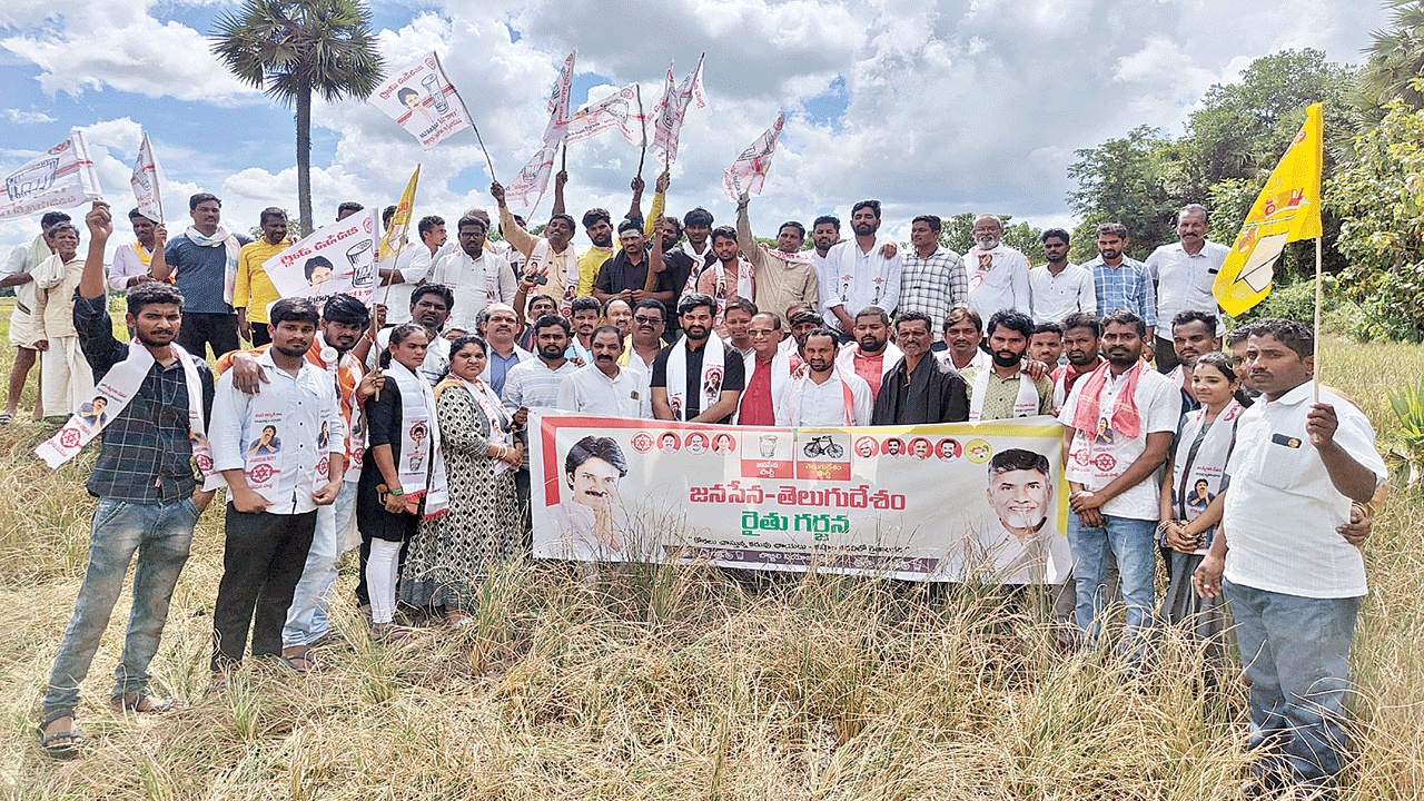 గంట్యాడ: వర్షభావంతో వరి పంటకు పూర్తిగా నష్టం వచ్చిందని, దీంతో రైతులు రోడ్డున పడ్డారని వెంటనే గజపతినగరం నియోజకవర్గంలోని అన్ని మండలాలను ప్రకటించాలని తెలుగుదేశం, జనసేన పార్టీ నాయకులు డిమాండ్ చేశారు. ఆదివారం బుడతనాపల్లి గ్రామంలో రైతు గర్జన కార్యక్రమం నిర్వహించారు. ఈసందర్భంగా ఎండిన వరి పొలాలను పరిశీలించి, ప్రభుత్వ తీరుకు వ్యతిరే కంగా నినాదాలు చేశారు. మాజీ ఎమ్మెల్యే కేఏ నాయుడు మాట్లాడుతూ గత నెల రోజుల నుంచి వర్షాలు లేకపోవడంతో వరి పంట పూర్తిగా ఎండిపోయిం దని, రైతు పెట్టిన పెట్టుబడి బూడిద పాలయ్యిందన్నారు. ఈ పరిస్థితిలో రైతులను ఆదుకోవాల్సిన బాధ్యత ప్రభు త్వంపై ఉందన్నారు. ఎండిన పంటలను స్థానిక ఎమ్మెల్యే పట్టించుకోలేదని ఆరోపించారు. మాజీ మంత్రి పడాల అరుణ మాట్లాడుతూ రాష్ట్రంలోని రైతులు పడుతున్న కష్టాలను ప్రభుత్వం పట్టించుకోలేదన్నారు. పంట నష్టం పోవడంతో అన్నదాతలు ఆర్థికంగా నష్టపోతున్నారని ఆరో పించారు. వెంటనే ఈ ప్రభుత్వం స్పందించాలని డిమాండ్ చేశారు. అనంతరం జనసేన నాయకుడు మర్రాపు సురేష్ మాట్లాడుతూ ఎకరానికి రూ.50వేలు చొప్పున రైతులకు అందజేయాలని డిమాండ్ చేశారు. ఈ కార్యక్రమంలో టీడీపీ నాయకులు కొండపల్లి భాస్కర్నాయుడు, బాలాజీ, చాణక్య, చైతన్య బాబు, జనసేన నాయుకులు ఆదాడ మోహనరావు, ఎం.రవికుమార్, అప్పల రాజు, ఎర్ని నాయుడు తదితరులు ఉన్నారు.