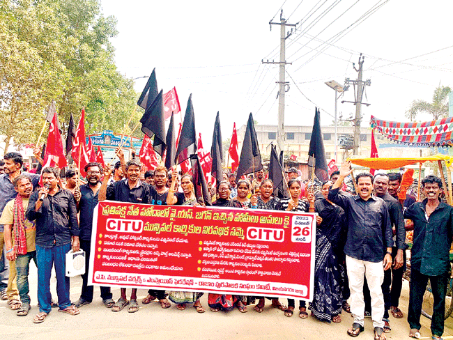 ఫ రాజాం రూరల్: సీఎం జగన్ ఇచ్చిన హామీలను అధికారంలోకి వచ్చిన తర్వా త అమలు చేయాలన్న కనీస ఆలోచన లేకపోవడం సిగ్గుచేటని సీఐటీయూ జిల్లా కార్యదర్శి రామ్మూర్తినాయుడు ఆరోపించారు. రాజాంలో మునిసిపల్ కార్మికులుర నల్లడ్రెస్సులు ధరించి, నల్లజెండాలు పట్టుకుని మునిసిపల్ కాంట్రాక్ట్, ఔట్సోర్సింగ్ ఉద్యోగులు నిరసన తెలిపారు. ప్రధాన రహదారిపై ర్యాలీ నిర్వహించారు.