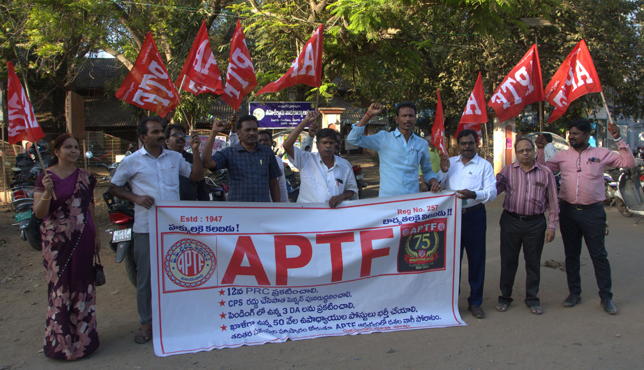 ఏలూరు రూరల్ / జంగారెడ్డిగూడెం టౌన్, ఫిబ్రవరి 15: పీఆర్సీ ప్రకటిం చి సీపీఎస్ను రద్దుచేసి పాత పెన్షన్ విధానాన్ని అమలు చేయాలని డిమాం డ్ చేస్తూ ఎపీటీఎఫ్ ఆధ్వర్యంలో బుధవారం తహసీల్దార్ కార్యాలయం వద్ద ధర్నా నిర్వహించారు. ఏపీటీఎఫ్ రాష్ట్ర కార్యదర్శి బీఎ సాల్మన్రాజు, జిల్లా అధ్యక్షుడు బి.రెడ్డిదొర మాట్లాడారు. జగన్ పాదయాత్ర సమయంలో అధి కారంలోకి వస్తే వారంలో సీపీఎస్పై నిర్ణయం తీసుకుంటామని చెప్పి నేటికీ హామీ నెరవేర్చలేదన్నారు. తక్షణం 12వ వేతన సంఘాన్ని నియమించాలని, పెండింగ్ డీఏలు మంజూరు చేసి ప్రతి నెలా 1న జీతాలు చెల్లించాలని డిమాండ్ చేశారు. 3, 4, 5 తరగతుల విలీనాన్ని రద్దు చేయాలని డిమాండ్ చేశారు. జిల్లా ప్రధాన కార్యదర్శి ఎస్ రంగావళి, కె భానుమూర్తి, ఎపీటీఎఫ్ నాయకులు తదితరులు పాల్గొన్నారు. జంగారెడ్డిగూడెం తహసీల్దార్ కార్యా లయం వద్ద ధర్నా నిర్వహించి అధికారులకు వినతిపత్రం అందజేశారు. ఏపీటీఎఫ్ జిల్లా కార్యదర్శి యూవీఎన్ నరసింహరాజు, మండల అధ్యక్ష, కార్యదర్శులు ఐవి రత్నం, సుబ్బారావు, ఉపాద్యాయులు పాల్గొన్నారు.
