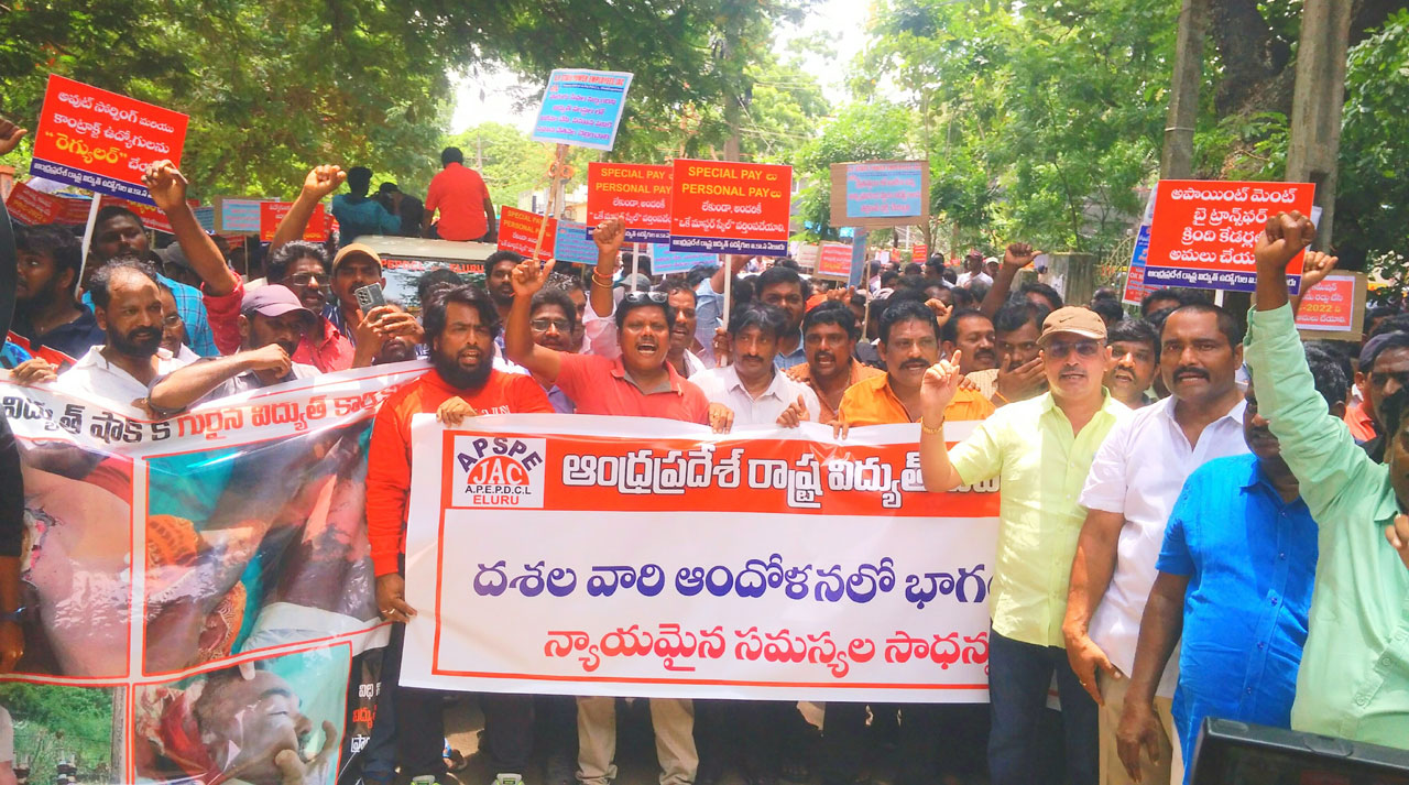 విద్యుత్ ఉద్యోగులకు వేతన సవరణ చేయాలని, ఉద్యోగుల కార్మికుల సమస్యలు పరిష్కరించాలని డిమాండ్ చేస్తూ ఏపీ రాష్ట్ర విద్యుత్ ఉద్యోగుల ఐక్య కార్యాచరణ సమితి ఆధ్వర్యంలో ఉద్యోగులు, కార్మికులు నిరసన తెలిపారు.