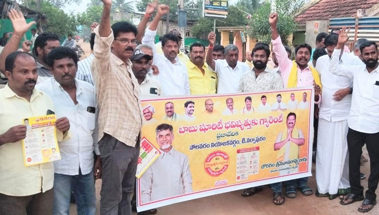టి.నరసాపురం, నవంబరు 9: రాష్ట్ర సర్వతోముఖాభివృద్ధి చంద్రబాబు తోనే సాధ్యమని, ప్రజల్ భవిష్యత్ గ్యారెంటీ అని టీడీపీ నియోజకవర్గ ఇన్చార్జ్ బొరగం శ్రీనివాసులు అన్నారు. టి.నరసాపురంలో బాబు షూరిటీ భవిష్యత్కు గ్యారెంటీ కార్యక్రమంలో భాగంగా గురువారం మినీ మేనిఫెస్టో ప్రజలకు వివరిస్తూ కరపత్రాలు పంపిణీ చేశారు. టీడీపీ రాష్ట్ర కార్యదర్శులు జయ్యవరపు శ్రీరామమూర్తి, శీలం వెంకటేశ్వరరావు, మండల అధ్యక్షుడు నా యుడు రామకృష్ణారావు గౌడ్, నల్లూరి వెంకట చలపతిరావు, తోట లక్ష్మీ నారాయణ, వాసిరెడ్డి మోహన్రావు, సందేపూడి సాయి, పిన్నమనేని మధు, పెద్దిన సత్యనారాయణ, జోనుబోయిన సోంబాబు, కొండపల్లి రవి, అను మోలు శ్రీనివాసరావు, దాసరి చంద్రశేఖర్, కొరివి వెంకటేశ్వరరావు, మోదుగు రామారావు, రాచబంటు వేములయ్య, తదితరులు పాల్గొన్నారు.