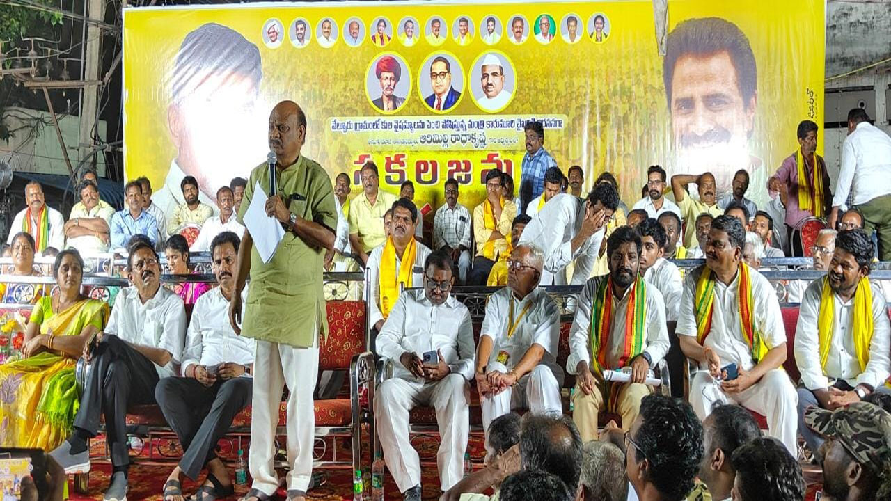 తణుకు, ఆగస్టు 5 : ప్రజలంతా విజ్ఞతతో ఆలోచించాలి. చెత్తపై పన్నువేసిన చెత్త ప్రభుత్వం. అభివృద్ధి లేదు. పిల్లల భవిష్యత్ కోసం ఆలోచించండి. రానున్న ఎన్నికల్లో వైసీపీని తరిమికొట్టి చంద్రబాబును సీఎం చేయండి’ అంటూ టీడీపీ పొలిట్ బ్యూరో సభ్యుడు, మాజీ మంత్రి చింతకాయల అయ్య న్నపాత్రుడు పిలుపునిచ్చారు. తణుకు మండలం వేల్పూరులో మంత్రి కారుమూరి బీసీల మధ్య కుల వైషమ్యాలు సృష్టించి నందుకు నిరసనగా మాజీ ఎమ్మెల్యే ఆరిమిల్లి రాధాకృష్ణ ఆధ్వ ర్యంలో సకల జనుల దీక్ష చేపట్టారు. ఈ సందర్భంగా అయ్య న్నపాత్రుడు మాట్లాడుతూ ‘పంచాయతీరాజ్ వ్యవస్థకు చట్టం ఉంది. గ్రామంలో ఏదైనా పనిచేయాలంటే పంచాయతీలో తీర్మానం చేయాలి. అంచనాలు రూపొందించాలి. కాని, తీర్మా నాలు చేయకుండా ఏ అధికారంతో వేల్పూరులో పనులు చేయించారు ?’ అని మంత్రిని నిలదీశారు. నాలుగున్నరేళ్ల జగన్పాలనలో అరాచకం రాజ్యమేలుతుందని విమర్శించారు. 16 నెలలు జైల్లో చిప్ప కూడు తిన్న నువ్వు కర్మ కొద్దీ సీఎంవు అయ్యావన్నారు. మీ మంత్రి ఉన్నాడు. దున్నపోతుకు ఓట్లు వేసి గెలిపించారు. సివిల్ సప్లయిస్లో ఎన్ని విభాగాలు ఉన్నా యో చెప్పనండి. వ్యాన్లపై వచ్చి బియ్యం కేజికి ఇస్తున్నారా ? ఆరు నెలల నుంచి రాష్ట్రప్రభుత్వం ఇచ్చే బియ్యం ఇవ్వడం లేదు. ఆ బియ్యం కాకినాడ నుంచి విదేశాలకు పోతున్నాయి. దానికి మంత్రి యాక్షన్ తీసుకోవాల్సి ఉందా ? లేదా ? టమా టా ధరలు పెరిగితే ధరలు తగ్గించాలి కదా. మీ నియోజక వర్గం పరువు మొత్తం తీసేశారు. టీడీఆర్ బాండుల ద్వారా రూ.800 కోట్లు కుంభకోణం. డబ్బులు ఇవ్వకుండా బాండ్లు ఇస్తానని చెబితే ప్రజలు నమ్మారు. పలితంగా ఎస్సీ కమిషనర్ సస్పెండయ్యారు. బెంగళూరు అపార్టుమెంట్ల కుంభకోణం నాకు తెలుసు. ఎర్రిపప్ప బెంగళూరు అపార్టుమెంటులో ఎంత అవినీతి ఉందో తేల్చుకుందాం. చర్చకు సిద్ధమా’ అంటూ మంత్రి కారుమూరికి సవాల్ చేశారు. ఆరిమిల్లిని ఎమ్మెల్యేగా గెలుపుంచుకోవాలని కోరారు. మాజీ మంత్రి పితాని సత్యనారాయణ మాట్లాడుతూ ‘ఇప్పుడు మనమంతా అప్రజాస్వామిక పాలనలో ఉన్నాం. త్వరలోనే జగన్ను ఓడించి, చంద్రబాబును ముఖ్యమంత్రిగా గెలిపించుకునేందుకు జనం సిద్ధంగా వున్నారు. మంత్రి కారుమూరి నాగేశ్వరరావు పద్ధతి మార్చుకోవాలి. బూతులు తిట్టడం సరికాదు. ప్రజా సంప్రదాయాలను పాటించాలి. పవన్ వస్తే కలవడానికి సిద్ధంగా ఉన్నాం’ అని అన్నారు.