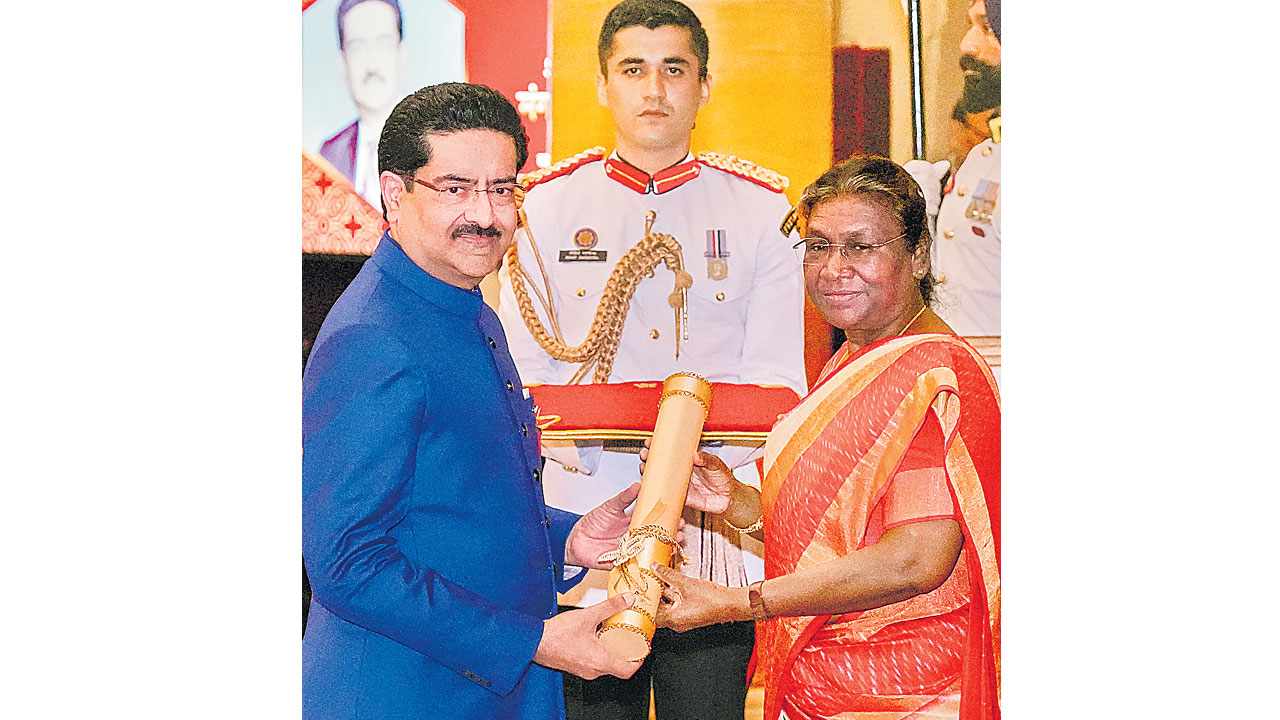 బుధవారం రాష్ట్రపతి భవన్లో జరిగిన పద్మ అవార్డుల కార్యక్రమంలో రాష్ట్రపతి ద్రౌపది ముర్ము చేతుల మీదుగా పద్మభూషణ్ పురస్కారాన్ని అందుకుంటున్న ఆదిత్య బిర్లా గ్రూప్ చైర్మన్ కుమార్ మంగళం బిర్లా