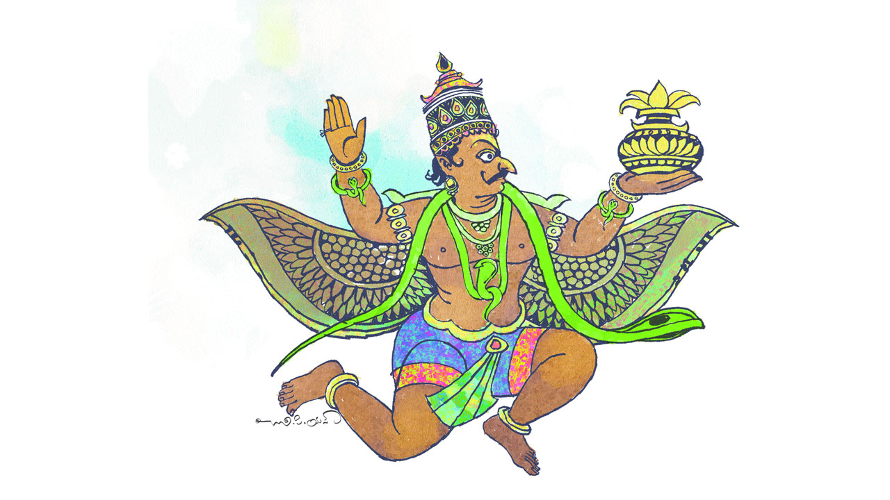 మందర పర్వతాన్ని కవ్వంగా, వాసుకిని కవ్వపుతాడుగా చేసుకుని దేవ దానవులు జరిపిన క్షీరసాగర మథనం నుంచి వరుసగా హాలాహలం, కామధేనువు, ఉచ్ఛైశ్రవం, ఐరావతం, కల్పవృక్షం, మహాలక్ష్మి బయల్వెడలగా, చివరగా అమృత కలశాన్ని చేత ధరించి విష్ణ్వాంశతో ధన్వంతరి అనే దివ్య పురుషుడు ఉద్భవించాడని పౌరాణిక కథనం. ఆ అమృత భాండం అమరలోకంలో భద్రపరచబడింది. మాతృదాస్య విముక్తికోసం ఆ అమృత భాండాన్ని సేకరిం చవలసిన అవసరం గరుత్మంతునికి కలిగింది. దీనికి సంబంధించి ఆంధ్ర మహాభారతం, ఆదిపర్వం, ద్వితీ యాశ్వాసంలో ఒక ఆసక్తికర ఉపాఖ్యానం వుంది. కశ్యప ప్రజాపతికి కద్రువ, వినత అని ఇద్దరు భార్యలు. వినతకు అనూరుడు, గరుత్మంతుడు సంతానం. కారణాంతరావల్ల వినత కద్రువకు దాస్యం చేయవలసివస్తుంది. తన తల్లి వినతకు దాస్యవిముక్తి కలిగించవలసిందిగా గరుత్మంతుడు కద్రువను కోరతాడు. అందుకు కద్రువ తనకు అమృతం తెచ్చి యివ్వమంటుంది. గరుత్మంతుడు దేవలోకం వెళ్లి ఇంద్రుణ్ణి జయించి అమృతం తెచ్చి కద్రువకు ఇచ్చి తల్లి వినతకు దాస్య విముక్తి చేశాడు. ఇంద్రుడు మాయో పాయం చేత ఆ అమృతాన్ని మళ్లీ ఇంద్రలోకం తీసుకు పోతాడు. స్థూలంగా ఇదీ కథ.