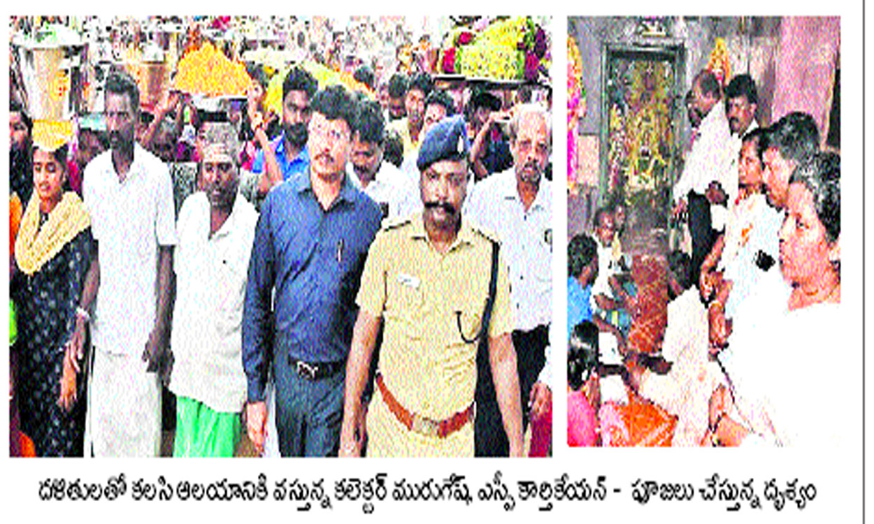 పెరంబూర్(చెన్నై), జనవరి 30: ఏడు దశాబ్ధాల చిరకాల వాంఛ నెరవేరిన తరుణంలో ఆ గ్రామంలోని దళిత కుటుంబాలన్నీ ఆనందంతో పరవశిస్తున్నాయి. తిరువణ్ణామలై జిల్లా తెన్ముడియనూర్ గ్రామంలోని ప్రాచీన ముత్తుమారియమ్మన్ ఆలయాన్ని కలెక్టర్, ఎస్పీ(Collector, SP) సమక్షంలో సోమవారం దర్శనం చేసుకున్న దళితులు, 70 ఏళ్ల కోరిక నెరవేర్చుకున్నారు. ఈ ఆలయంలోకి దళితులు ప్రవేశించి పూజలు చేసేందుకు కొన్ని వర్గాలు అభ్యంతరం తెలిపాయి. పండుగ, విశేష రోజుల్లో జరిగే పూజలకు సైతం వీరిని అనుమతించడం లేదు. తమకు కూడా ఆలయంలోకి అనుమతించి స్వామివారిని దర్శించి పొంగళ్లు పెట్టేందుకు అవకాశమివ్వాలని దళితులు కోరుతున్నా, అగ్రవర్ణాలు వారిని ఆలయ దరిదాపుల్లోకి రానివ్వడం లేదు. దళితులకు అండగా వామపక్షాలు, డీపీఐ, ప్రజా సంఘాలు పులు పోరాటాలు చేపడుతున్నాయి. ఈ నేపథ్యంలో, ఆలయంలో ప్రారంభమైన తైపూస ఉత్సవాల్లో ఒకరోజు తమను అనుమతించేలా చర్యలు చేపట్టాలని దళితులు జిల్లా కలెక్టర్ మురుగేశ్కు వినతిపత్రం సమర్పించారు. కలెక్టర్ ఉత్తర్వులతో తహసీల్దార్ మందాకిని నేతృత్వంలో అధికారులు గ్రామంలోని అన్ని వర్గాలతో చర్చించారు. హిందూ దేవాదాయ శాఖ ఆధీనంలోని ఈ ఆలయంలో జాతి, మత బేధం లేకుండా అందరినీ అనుమతించాలని, అడ్డుకున్న వారిని కఠినంగా శిక్షిస్తామని హెచ్చరించారు. అధికారులు చర్చలు జరిపినా దళితుల ఆలయ ప్రవేశానికి కొందరు అనుమతించలేదు. ఈ నేపథ్యంలో, మహాత్మాగాంధీ జయంతి సందర్భంగా అంటరానితనం నిర్మూలన ప్రతిజ్ఞకు న్యాయం చేకూర్చేలా దళితులను సోమవారం ఆలయ ప్రవేశం చేయించాలని జిల్లా కలెక్టర్ నిర్ణయించారు. దీంతో, శనివారం రాత్రి నుంచే గ్రామానికి పెద్దసంఖ్యలో పోలీసులు చేరుకున్నారు. సోమవారం ఉదయం వేలూరు డీఐజీ ముత్తుస్వామి, కలెక్టర్ పి.మురుగేష్, జిల్లా ఎస్పీలు కార్తికేయన్ (తిరువణ్ణామలై), బాలకృష్ణన్ (తిరుపత్తూర్), హిందూ దేవాదాయ శాఖ మండల జాయింట్ కమిషనర్ అశోక్కుమార్, తహసీల్దార్ మందాకిని నేతృత్వంలో దళితులు పూజా సామగ్రి తీసుకొని తమ ప్రాంతం నుంచి ఊరేగింపుగా ఆలయంలో ప్రవేశించి, పూజలు చేసి పొంగళ్లు పెట్టారు.