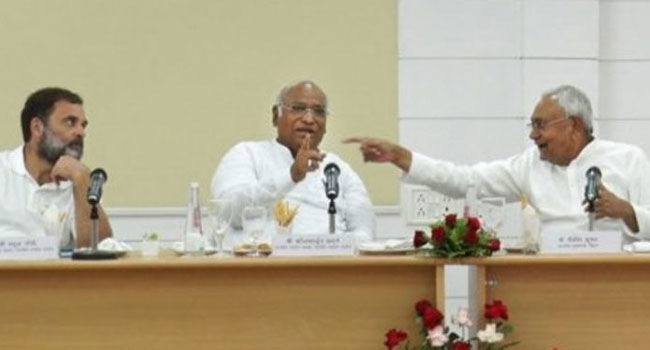 కాగా.. తొలిసారి పాట్నాలో నితీశ్ కుమార్ ఆధ్వర్యంలో జరిగిన సమావేశంలో మల్లిఖార్జున ఖర్గే, రాహుల్ గాంధీ, మమతా బెనర్జీ, అరవింద్ కేజ్రీవాల్, ఎంకే స్టాలిన్, హేమంత్ సోరెన్, అఖిలేష్ యాదవ్, ఉద్ధవ్ థాకరే, శరద్ పవార్, ఒమర్ అబ్దుల్లా, మెహబూబా ముఫ్తీ తదితర నేతలు పాల్గొన్నారు. ఆరోజు జరిగిన మీడియా సమావేశంలో రాహుల్ గాందీ మాట్లాడుతూ.. ఇది సిద్ధాంతాల మధ్య పోరు అని పేర్కొన్నారు. నిజానికి, తమలో విభేదాలు ఉన్నప్పటికీ కలిసికట్టుగా పోరాడాలని నిర్ణయించుకున్నామని, సిద్ధాంతాలపై పరస్పరం చర్చించుకుని వాటిని పరిరక్షించుకునేందుకు కృషిచేయాలని నిర్ణయించామని చెప్పారు. దేశపునాదులపై బీజేపీ దాడి చేస్తోందని, ప్రతిపక్షాలన్నీ ఐక్యంగా పోరాడితేనే దేశాన్ని రక్షించుకోవచ్చని అన్నారు
