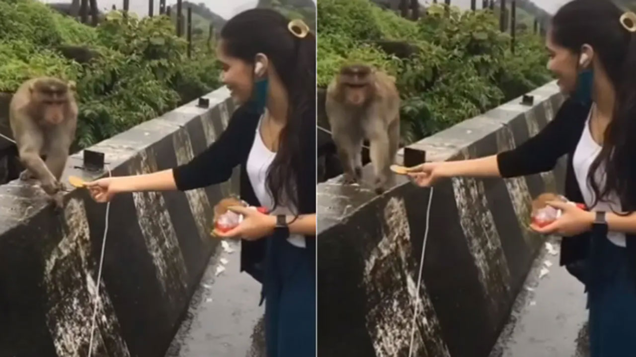సాధారణంగా రోడ్డు మీద ఎవైనా జంతువులు కనిపించినపుడు కొందరు వాటికి ఆహారం (Food) ఇస్తుంటారు. వీధి కుక్కలు, పిల్లులు, కోతులు మొదలైనవి కనిపించినపుడు వాటికి ఆహారం ఇవ్వడానికి కొందరు ఆసక్తి చూపుతుంటారు. ఆయా జంతువులు కూడా ఆ ఆహారాన్ని తీసుకుని తింటాయి. అయితే ప్రస్తుతం వైరల్ అవుతున్న ఓ వీడియో (Viral Video) చూస్తే మాత్రం షాక్ అవక తప్పదు. ఆ ఫన్నీ వీడియో సోషల్ మీడియా జనాలను బాగా ఆకట్టుకుంటోంది (Monkey Videos).