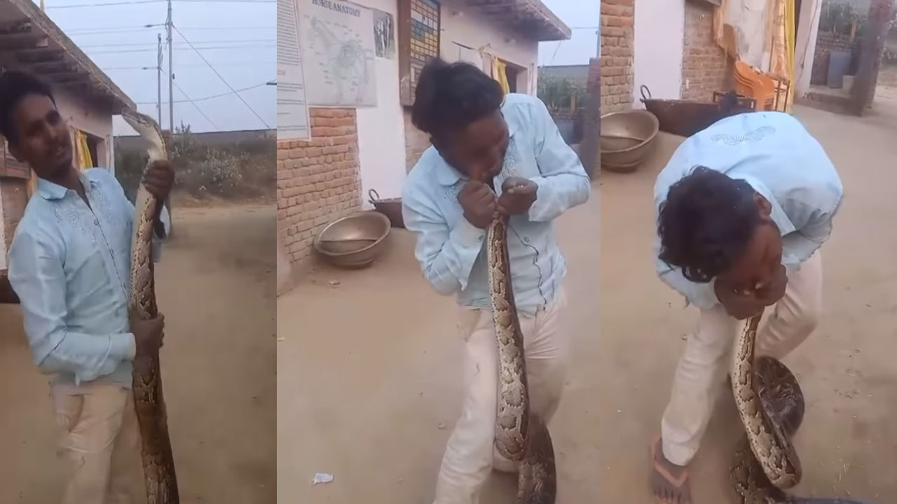 therealtarzann అనే ఇన్స్టాగ్రామ్ హ్యాండిల్లో ఈ వీడియో షేర్ అయింది. వైరల్ అవుతున్న ఆ వీడియోలో ఒక వ్యక్తి తన చేతులతో కొండచిలువను పట్టుకుని దానితో ఆటలాడుతున్నాడు. అతడి తీరు చూస్తుంటే అతడు నిపుణుడు కాదని అర్థమవుతోంది. అయినా అతడు కొండచిలువను ధైర్యంగా పట్టుకున్నాడు. దాని తలపై ముద్దాడడానికి ప్రయత్నించాడు. ఆ సమయంలో కొండచిలువ అతడి మొహాన్ని కొరికేసింది. ఆ కొండ చిలువ దంతాలు ఆ వ్యక్తి చెంపలో ఇరుక్కున్నాయి (Python Video).