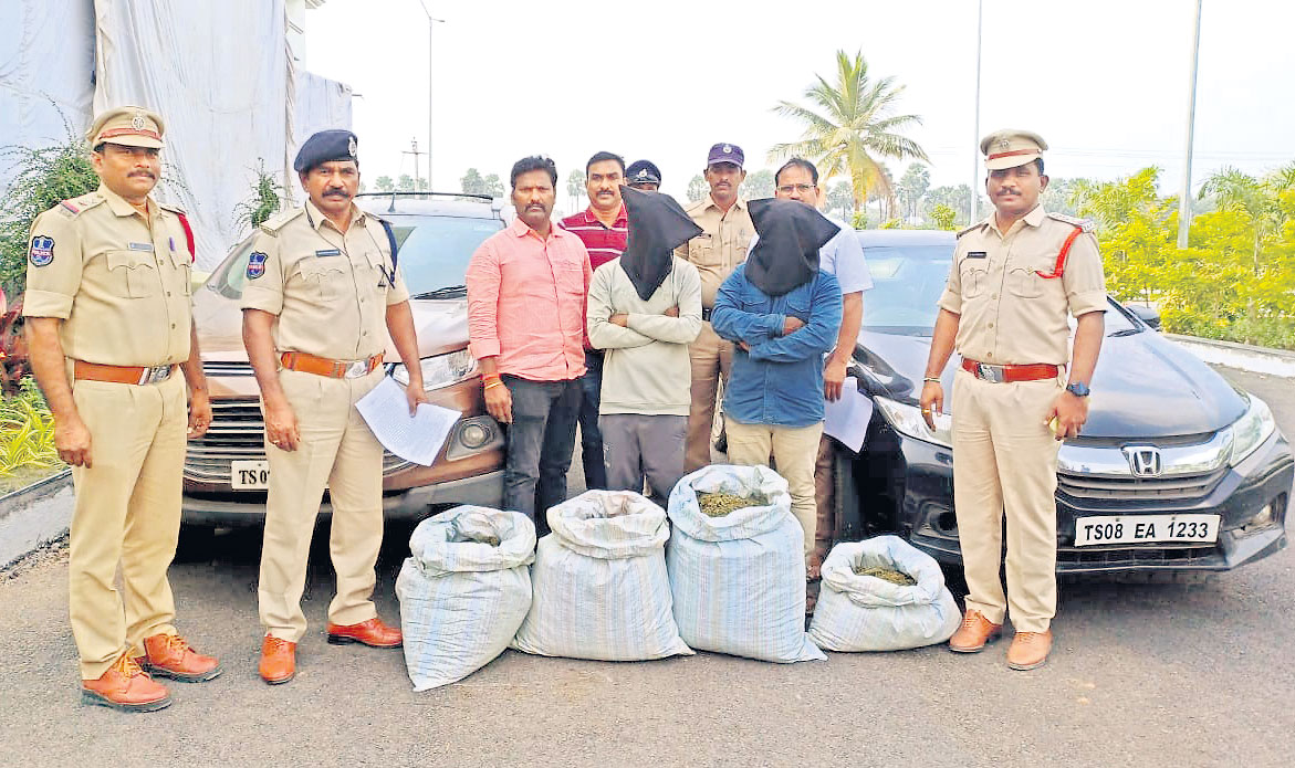 సూర్యాపేట, డిసెంబరు 28 (ఆంధ్రజ్యోతి): గంజాయిని రవాణా చేస్తున్న ఇద్దరిని సూర్యాపేట జిల్లా పోలీసులు అరెస్టుచేసి వారినుంచి రూ.5లక్షల విలువైన 25కిలోల గంజాయిని స్వాధీనం చేసుకున్నారు. గురువారం సూర్యాపేట జిల్లా పోలీస్ కేంద్ర కార్యాలయంలో ఏర్పాటు చేసిన విలేకరుల సమావేశంలో ఈ కేసు వివరాలను అదనపు ఎస్పీ నాగేశ్వర్రావు వివరించారు. సూర్యాపేటలోని ఎన్టీఆర్ పార్క్ వద్ద అనుమానాస్పదంగా ఆపి ఉన్న రెండు కార్లను స్థానికులు గుర్తించి పోలీసులకు సమాచారం ఇచ్చారు. పోలీస్ సిబ్బంది వాటిని తనిఖీ చేయగా, ఒక కారులో 24కిలోల గంజాయి, మరో కారులో కిలో గంజాయి ఉంది. గంజాయి రవాణా చేస్తున్న వారిని నాగర్కర్నూలు జిల్లా అమ్రాబాద్ మండలం వటవర్లపల్లి గ్రామానికి చెందిన చారకొండ ప్రకాష్, మిర్యాలగూడలోని శాంతినగర్కు చెందిన తాళ్ల సుమంత్గా గుర్తించారు. ఐదేళ్ల నుంచి ప్రకాష్, సుమంత్ స్నేహితులు కాగా, నాగర్కర్నూల్కు చెందిన ప్రకాష్ స్వగ్రామంలో వ్యవసాయం చేస్తున్నాడు. మిర్యాలగూడకు చెందిన సుమంత్కు గంజాయి పీల్చే అలవాటు ఉంది. గంజాయిని సాగు చేసి హైదరాబాద్లో విక్రయిస్తే ఎక్కువ లాభాలు వస్తాయని సుమంత్ చెప్పటంతో ప్రకా్ష తన స్వగ్రామంలో గంజాయి సాగు చేశాడు. నెల రోజుల క్రితం పంటను కోసినట్లు సుమంత్కు సమాచారం ఇవ్వటంతో ఈ నెల 27వ తేదీన వటవర్లపల్లికి వెళ్లి గంజాయిని తన అత్తగారి ఊరైన సూర్యాపేటకు తీసుకువచ్చాడు. హైదరాబాద్కు చెందిన మిత్రుడు భార్గవ్రామ్కు ఫోన్చేసి గంజాయి కావాలంటే సూర్యాపేటకు రావాలని చెప్పాడు. గురువారం ఉదయం భార్గవ్రామ్ కారులో సూర్యాపేటలోని ఎన్టీఆర్ పార్కు వద్దకు చేరుకుని సుమంత్, ప్రకాష్ల నుంచి కిలో గంజాయిని కొనుగోలు చేసి కారులో దాచాడు. సమాచారం తెలుసుకున్న పోలీసులు వారి వాహనాలు తనిఖీలు చేసి ప్రకాష్, సుమంత్ను అరెస్టు చేసి 24కిలోల గంజాయిని స్వాధీనం చేసుకున్నారు. పోలీసులను గమనించిన భార్గవ్రామ్ తన కారును అక్కడే వదిలిపెట్టి పరారయ్యాడు. ఈ కారుతో పాటు కారులో ఉన్న కిలో గంజాయిని పోలీసులు స్వాధీనం చేసుకున్నారు. ఈ కేసులో చాకచక్యంగా వ్యవహరించి నిందితులను అదుపులోకి తీసుకున్న సూర్యాపేట పట్టణ సీఐ రాజశేఖర్, సీసీఎస్ ఇన్స్పెక్టర్ నాగార్జున, ఎస్లు సైదులు, రవీందర్ను అదనపు ఎస్పీ అభినందించారు.