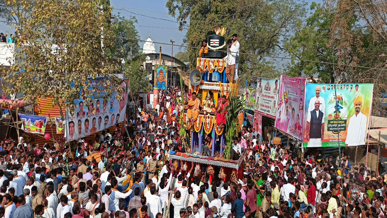 సారంగాపూర్, పిబ్రవరి, 20: శ్రీ దుబ్బ రాజన్న రథోత్సవ వేడుకలు సోమవారం అంగరంగ వైభవంగా జరిగాయి. శివరాత్రిని పురస్కరించుకుని ఐదు రోజుల పాటు అత్యంత వైభవంగా ఉత్సవాలు నిర్వహించారు. ఈ వేడుకల్లో ప్రధానఘట్టం రథోత్సవం చివరిరోజు కావడంతో వేడుకలను తిలకించేందుకు జిల్లా నలుమాలల నుంచే కాకుండా మహరాష్ట్ర, ఉమ్మడి ఆదిలాబాద్ జిల్లా నుంచి పెద్ద ఎత్తు న భక్తులు తరలి వచ్చారు. ఐదు రోజుల పాటు జరిగిన ఈ ఉత్సవాలకు 2 లక్షల పైన భక్తులు స్వామి వారిని దర్శంచుకున్నట్లు ఆల య అధికారులు తెలిపారు. రథోత్సవం సందర్భంగా వివిధ రకాల పూలతో రథాన్ని అందంగా అలంకరించారు. రథం ఎదుట ప్రత్యేక పూజలు నిర్వహించిన అనంతరం ఉత్సవ మూర్తులను రథంపై ఉంచి ఆలయ పురవీధుల గుండా ఊరేగించారు. ఈ సమయంలో శివనామ స్మరణలతో ఆలయ పురవీధులు మార్మోగాయి. వేడుకల్లో భక్తులకు ఎలాంటి ఇబ్బందులు కలగకుండా డీఎస్పీ ప్రకాష్ దగ్గ రుండి ఏర్పాట్లను పర్యవేక్షించారు. సీఐ అరీప్ అలీఖాన్, ఎసై మనో హర్రావు సూచనల మేరకు రోప్ పార్టీ సహాయంతో రథాన్ని ముం దుకు లాగారు. భక్తులు పెద్ద ఎత్తున్న తరలి వచ్చి రథం వద్ద మొ క్కులు చెల్లించుకున్నారు. రథం ఎదుట ఒగ్గుడోలు కళాకారుల వి న్యాసాలు భక్తులను ఎంతగానో ఆకట్టుకున్నాయి. ఈ వేడుకల్లో ఎం పీపీ కోల జమున శ్రీనివాస్, జడ్పీటీసీ మనోహర్రెడ్డి, వైస్ ఎంపీపీ సురేందర్, సీనియర్ నాయకులు ముప్పాల రాంచందర్రావు, కొలు ముల రమణ, సర్పంచ్లు, బొడ్డుపెల్లి రాజన్న, ఆకుల జమున రాజి రెడ్డి, గుర్రాల రాజేందర్రెడ్డి, ఈవో కాంతరెడ్డి, ఆలయ చైర్మన్ శంక రయ్య, మండల కాంగ్రెస్ పార్టీ అధ్యక్షులు రాంచందర్రెడ్డి, ఎంపీ టీసీ సుధాకర్రావు, డిల్లీరామరావు, బీజేపీ మండల అధ్యక్షులు వరు ణ్కుమార్, మాజీ సర్పంచ్ శేఖర్గౌడ్, యువ నాయకలు తోట లక్ష్మణ్, ఆలయ ధర్మకర్తలు పాల్గొన్నారు