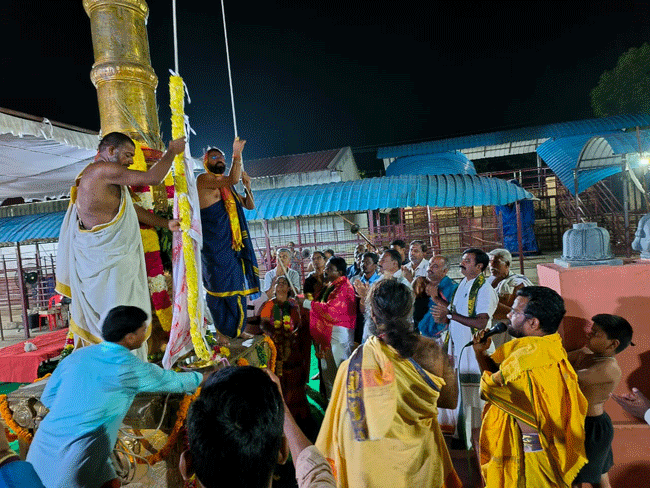 అలంపూరు, జనవరి22: జోగుళాంబ అమ్మవారి వార్షిక బ్రహ్మోత్సవాలు ఆదివారం అంగరంగ వైభవంగా ప్రా రంభమయ్యాయి. అర్చకులు ఉదయం స్వామివారి ఆనతి స్వీకరణ, మహాగణపతి పూజ, రుత్విక్ వరణం, పున్యాహ వచనం, యాగశాల ప్రవేశం, మహా కలశస్థాపన మొద లైన కార్యక్రమాలు నిర్వహించారు. సాయంత్రం అంకు రార్పణ, ధ్వజారోహణ పూజలు నిర్వహించారు. ఉదయం చండీహోమం వద్ద అ ర్చకులకు ఆలయ కమి టీ చైర్మన్ శ్రీనివాసరెడ్డి, ఈవో పురేందర్కుమార్ పట్టు వస్త్రాలను అందజేశారు. ముందు గా బాలబ్ర హ్మేశ్వర ఆలయం నుంచి ఆ లయ ప్రధాన అర్చకు డు ఆనంద్ శర్మ ప ట్టువస్త్రాలను తీసుకెళ్లి అమ్మవారికి, స్వామి వారికి అందించారు. బాలబ్రహ్మేశ్వర స్వామి మూలవిరాట్కు ఈవో పురేంధర్కుమార్, అ ర్చకులు, సిబ్బంది ప ల్లకీ సేవ నిర్వహిం చారు. అనంతరం అమ్మవారి ఆలయంలో ప్రత్యేక పూజ లు చేశారు. రాత్రి నిర్వహించిన ధ్వజారోహణ కార్యక్ర మానికి ఎమ్మెల్యే డాక్టర్ వీఎం అబ్రహాం, అలంపూరు మునిసిపల్ చైర్పర్సన్ మనోరమ్మ హాజరుకాగా, పూర్ణ కుంభంతో స్వాగతం పలికారు. అమ్మవారి ఆలయ అర్చ కుడు విక్రాంత్ శర్మ ధ్వజస్తంభానికి ప్రత్యేక హారతి ఇ చ్చారు. కార్యక్రమంలో ఆలయ అర్చకులు, ధర్మకర్తలు ఉ షాదేవి, జయ్యన్న, విష్ణువర్ధన్ రెడ్డి, ఆలయ ముఖ్య అర్చ కులు ఆనంద్ శర్మ, శ్రీకాంత్ శర్మ, ఆలయ మాజీ చైర్మన్ నారాయణ రెడ్డి, బీఆర్ఎస్ నాయకులు పాల్గొన్నారు.