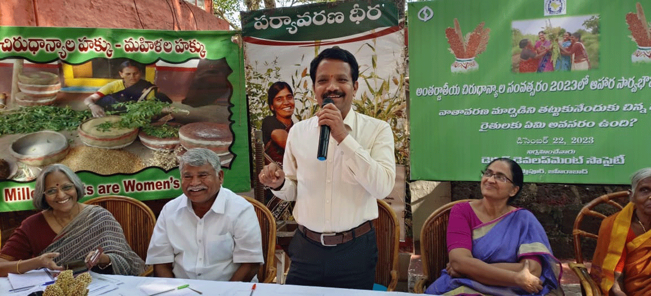 ప్రభుత్వాలు వాణిజ్య పంటలను సాగుచేసే రైౖతులకు వివిధరకాల ప్రోత్సహకాలను అందజేఊ్త, చిరుధాన్యాలను సాగుచేసే రైతులను పట్టించుకోవడంలేదని విచారం వ్యక్తం చేశారు. ప్రజారోగ్యం, భూముల ఆరోగ్యం, ఆహార పంటల విస్తరణ, వాతావరణ మార్పులు తదితరాలు వ్యవసాయ రంగంతో ముడిపడి ఉన్నాయని పేర్కొన్నారు. ఈ విషయాలను పక్కన పెడుతూ చిరుధాన్యాల రైతులను ప్రభుత్వాలు అజ్ఞానులుగా చూస్తున్నారని ఆవేదన వ్యక్తంచేశారు. కార్పొరేట్ వ్యవసాయంచేసే రైతులకు ప్రభుత్వాలు సహకరించడాన్ని ఆమె తప్పుపట్టారు. దేశవ్యాప్తంగా 76 శాతం మంది ప్రజలకు ఆహారభద్రత లేదన్నారు. గ్రామాల్లో పశుసంపదను పెంపొందించేలా కృషిచేస్తే సేంద్రియ ఎరువుల ఆధారంగా పండే పంటల్లో పోషకాలు అధికంగా ఉంటాయని, భూమి కూడా బాగుంటుందన్నారు. అనంతరం వ్యవసాయశాఖ ఏడీఏ భిక్షపతి మాట్లాడుతూ డీడీఎస్ ఎన్జీవోతోపాటు వివిధ ఎన్జీవోలకు చెందిన ప్రతినిధుల డిమాండ్ను ప్రభుత్వం దృష్టికి తీసుకుపోతామన్నారు. చిరుధాన్యాలల్లో పోషక సమతుల్యత ఉంటుందన్నారు. చిరుధాన్యాల రైతులు మార్కెట్లో చిరుధాన్యాల డిమాండ్ పెంచేలా సృష్టికర్తలు తయారుకావాలన్నారు. అన్నిరకాల పంటలకు ప్రభుత్వ పరంగా వచ్చే నష్టపరిహారాలను అందిస్తున్నామన్నారు. అనంతరం వివిధ ఎన్జీవోల సభ్యులు, ప్రముఖ జర్నలిస్టులు సజేయ, రమేష్ తదితరులు మాట్లాడుతూ చిరుధాన్యాలకు మార్కెట్లో డిమాండ్ ఉన్నప్పటికీ ప్రభుత్వాల నిర్లక్ష్యం ఫలితంగా తగినంత ఉత్పత్తులను పండించలేకపోతున్నారన్నారు. కార్యక్రమంలో పీస్ డైరెక్టర్ నిమ్మయ్య, పిలుపు డైరెక్టర్ అమరేంద్ర, సంగారెడ్డి, సిద్దిపేట, వరంగల్, వికారాబాద్, యాదాద్రిభువనగిరి తదితర జిల్లాల రైతులు పాల్గొన్నారు.