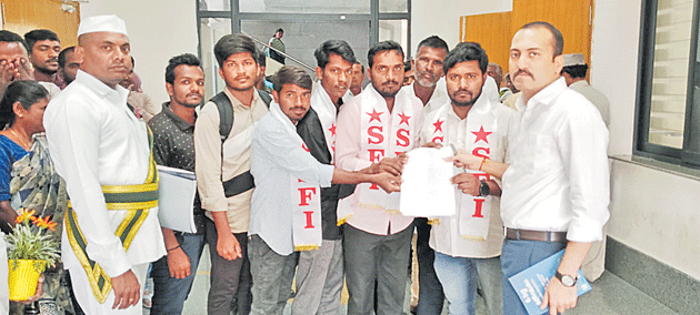 కలెక్టర్కు వినతిపత్రం అందజేస్తున్న ఎస్ఎ్ఫఐ నాయకులు
