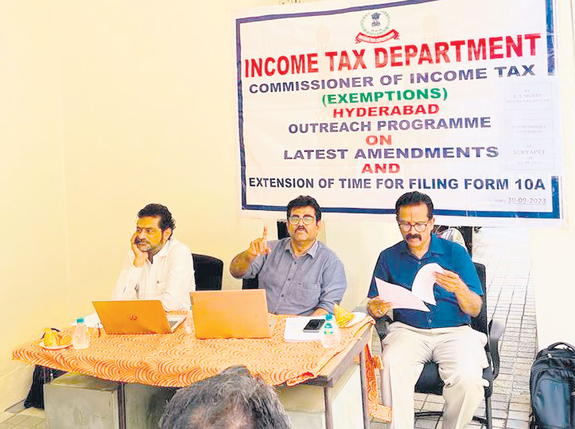 సూర్యాపేట టౌన, ఆగస్టు 22: ఆదాయపు పన్నుకు సంబంధించి ఫారం- 10ఏను సెప్టెంబరు 30వ తేదీ లోపు దాఖలు చేయాలని ఆదాయపు పన్నుశాఖ జిల్లా అధికారి వి.సూర్యనారాయణమూర్తి అన్నారు. మంగళవారం జిల్లా కేంద్రంలోని ఆదాయపు పన్నుశాఖ కార్యాలయంలో ఫారం 10-ఏ పై నిర్వహించిన అవగాహన సదస్సులో ఆయన మాట్లాడారు. ఆదాయ పన్ను చట్టాలు, నూతన సవరణలు, మినాయింపులపై ప్రతి ఒక్కరూ అవగాహన కలిగిఉండాలని తెలిపారు. ఆదాయపు పన్ను రిటర్న్లు, ఐటీఐఆర్-7, ఫారం 10-ఏ, 10-బిలను గడువులోగా అందజేయాలన్నారు. కార్యక్రమంలో అధికారులు కె.సాయిశంకర్, ఇనస్పెక్టర్లు రవి, కె.మహేష్, ఎం.సాయికుమార్, డీఎల్ మారుతిప్రసాద్, అడిటర్లు, అకౌంటెంట్లు పాల్గొన్నారు.