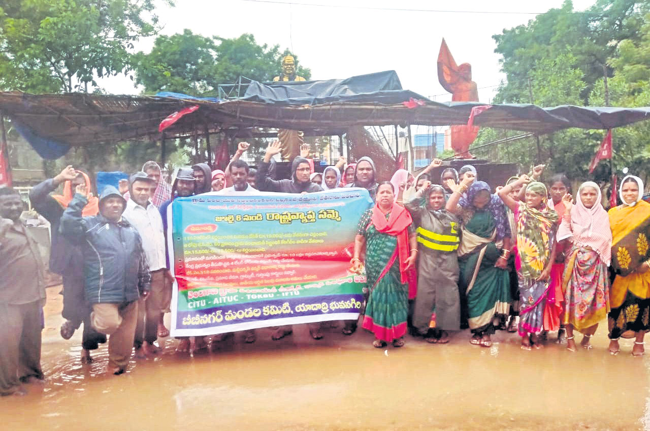 బీబీనగర్, జూలై 20: పంచాయతీ బీబీనగర్ మండల కేంద్రంలో మండల పరిషత్ కార్యాలయం వద్ద సమస్యల పరిష్కారం కోసం సమ్మె కొనసాగిస్తున్న గ్రామ పంచాయతీ కార్మికులు గురువారం దీక్షా శిబిరం వద్ద వర్షంతో తడుస్తూ నిరసన వ్యక్తం చేశారు. ఈ సందర్భంగా సీఐటీయూ మండల కన్వీనర్ గాడి శ్రీనివాస్ మాట్లాడుతూ పంచాయతీ కార్మికులను పర్మినెంట్ చేసి కనీస వేతనం 21వేలు చెల్లించాలని డిమాండ్ చేశారు. శుక్రవారం కలెక్టర్ కార్యాయం ఎదుట నిర్వహించ తలపెట్టిన ధర్నాను వర్షాల కారణంగా వాయిదా వేస్తున్నట్లు తెలిపారు. కార్యక్రమంలో పొట్ట యాదమ్మ, పాశం బాలయ్య, యాదగిరి, రమేష్, గోవింద్ పోచయ్య, నర్సమ్మ, రవి, అండాలు, చంద్రభాను పాల్గొన్నారు.