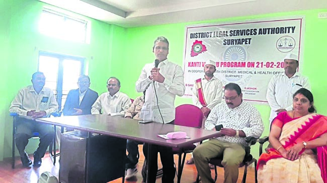 సూర్యాపేటలీగల్, ఫిబ్రవరి 21: సర్వేంద్రియానాం.. నయనం ప్రధానమని జిల్లా ప్రధాన న్యాయమూర్తి, జిల్లా న్యాయసేవాధికార సంస్థ చైర్మన్ బి.గౌతమ్ప్రసాద్ అన్నారు. మంగళవారం జిల్లా కోర్టు ప్రాంగణంలో జిల్లా న్యాయసేవాధికార సంస్థ ఏర్పాటు చేసిన కంటి వెలుగు కార్యక్రమాన్ని ప్రారంభించి మాట్లాడారు. కంటి చూపు లేనివారిని ఆదరించి, అక్కున చేర్చుకోవాలన్నారు. కోర్టు ప్రాంగణంలో నిర్వహించిన కంటి వెలుగు కార్యక్రమంలో న్యాయవాదులు, కోర్టు సిబ్బందికి కంటి పరీక్షలు నిర్వహించారు. కార్యక్రమంలో సీనియర్ సివిల్ జడ్జి శ్రీవాణి, అదనపు జూనియర్ సివిల్ జడ్జి జె.ప్రశాంతి, జిల్లా వైద్యాధికారి కోటాచలం, బార్ అసోసియేషన్ అధ్యక్షుడు గోండ్రాల అశోక్, ప్రధాన కార్యదర్శి సోమేశ్వర్, జె.శశిధర్, వసం త సత్యనారాయణపిళ్లై పాల్గొన్నారు.