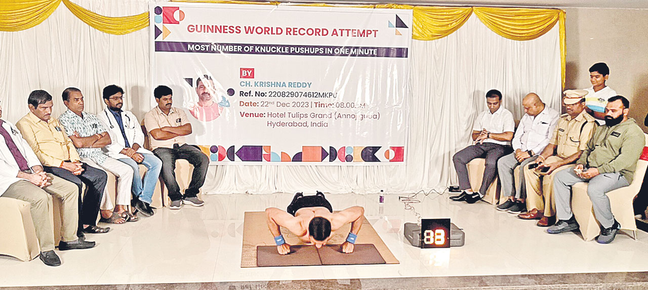 నకుల్ పుషప్స్లో గిన్నీస్బుక్ రికార్డును తిరగరాసేందుకు ఘట్కేసర్కు చెందిన చింతల కృష్ణారెడ్డి ప్రదర్శన చేశాడు.