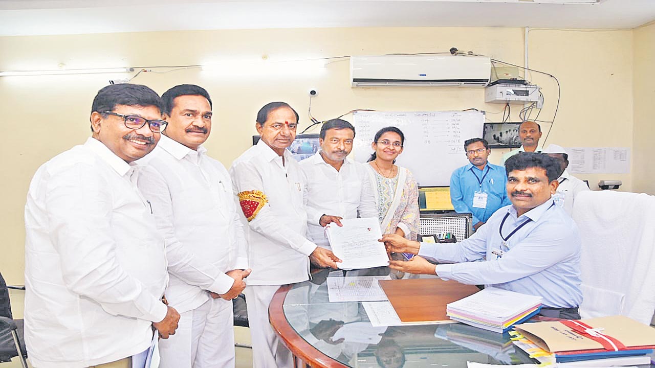 గజ్వేల్ బీఆర్ఎస్ అభ్యర్థిగా కేసీఆర్ గురువారం నామినేషన్ దాఖలు చేశారు. ఎర్రవల్లిలోని తన వ్యవసాయ క్షేత్రం నుంచి గజ్వేల్లోని ఐవోసీ మైదానానికి హెలికాప్టర్లో వచ్చిన ముఖ్యమంత్రి.. ప్రత్యేక వాహనంలో ఆర్డీవో కార్యాలయానికి వెళ్లి నామినేషన్ను సమర్పించారు. సరిగ్గా 11.18 నిమిషాలకు నామినేషన్ పత్రాలను ఆర్డీవో బన్సీలాల్కు అందజేశారు. తిరుగు ప్రయాణంలో హెలీప్యాడ్ వద్ద వేచి ఉన్న యాదవరెడ్డి, ప్రతా్పరెడ్డి, ఎలక్షన్రెడ్డి, భూంరెడ్డి, ఇతర నాయకులతో మాట్లాడిన ఆయన.. అంతా కలిసి పనిచేయాలని సూచించారు.