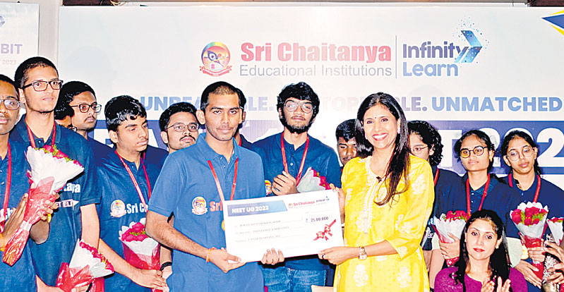 హైదరాబాద్ సిటీ, జూన్ 14 (ఆంధ్రజ్యోతి): నీట్-2023 ఫలితాల్లో శ్రీ చైతన్య విద్యా సంస్థల విద్యార్థులు ప్రభంజనం సృష్టించారు. శ్రీ చైతన్య విద్యార్థి బోర వరుణ్ చక్రవర్తి... 720కి 720 మార్కులతో ఓపెన్ కేటగిరీలో ఆలిండియా 1వ ర్యాంకు సాధించారు. మరో విద్యార్థి ఎస్.వరుణ్ 715 మార్కులతో ఓపెన్ కేటగిరీలో 9వ ర్యాంకును కైవసం చేసుకున్నారు. వీరితోపాటు శశాంక్ కుమార్, కంచని రఘురామ్ రెడ్డి.. వరుసగా 14వ, 15వ ర్యాంకులను దక్కించుకున్నారు. ఆలిండియా ఓపెన్ కేటగిరీలో టాప్-50 లోపు 9, టాప్-100లోపు 16 ర్యాంకులను శ్రీ చైతన్య విద్యార్థులు సాధించారు. ఈ సందర్భంగా ర్యాంకులు సాధించిన విద్యార్థులు, వారి తల్లిదండ్రులను బంజారాహిల్స్లోని ఓ హోటల్లో బుధవారం కాలేజీ యాజమాన్యం ఘనంగా సన్మానించింది. ఆలిండియా మొదటి ర్యాంక్ సాధించిన బోర వరుణ్ చక్రవర్తికి రూ.25 లక్షలు, 9వ ర్యాంక్ సాధించిన వరుణ్కు రూ.10లక్షల చెక్కును శ్రీ చైతన్య విద్యాసంస్థల అకడమిక్ డైరెక్టర్ సుష్మ అందించారు. అనంతరం ఆమె మాట్లాడుతూ నీట్ -23 పరీక్షకు దేశవ్యాప్తంగా 20లక్షల మంది హాజరు కాగా, శ్రీ చైతన్య విద్యార్థులు విశేష ప్రతిభ కనబరిచి ర్యాంకులు సాధించారన్నారు. నిష్ణాతులైన ఫ్యాకల్టీ సహకారంతో ఆఫ్లైన్, ఆన్లైన్ విధానాల్లో నాణ్యమైన శిక్షణ అందించడం వల్లే ఇంతటి అద్భుత ఫలితాలు సాధ్యమయ్యాయన్నారు. ర్యాంకులు సాధించిన విద్యార్థులు, వారి తల్లిదండ్రులు, అధ్యాపక సిబ్బందిని శ్రీ చైతన్య విద్యా సంస్థల అధిపతి బీఎస్.రావు అభినందించారు.