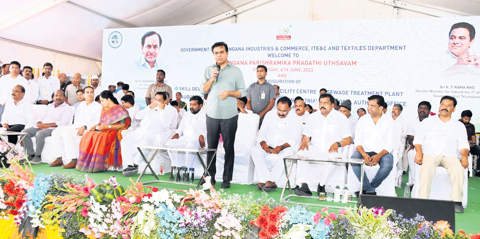 చౌటుప్పల్ /చౌటుప్పల్ రూరల్, జూన్ 6: తెలంగాణలో 60ఏళ్లలో జరగని అభివృద్ధిని తొమ్మిదేళ్లలో చేసి చూపించిన ఘనత సీఎం కేసీఆర్కే దక్కుతుందని ఐటీ, పరిశ్రమల శాఖ మంత్రి కేటీఆర్ అన్నారు. దశాబ్ధి ఉత్సవాల్లో భాగంగా చౌటుప్పల్ మండలం దండుమల్కాపురం గ్రామంలోని గ్రీన్ ఇండస్ర్టీయల్ పార్కులో మంగళవారం తెలంగాణ పారిశ్రామిక ప్రగతి ఉత్సవం నిర్వహించారు. ఇండస్ర్టియల్ పార్కులో 51 కంపెనీలను, రూ.41కోట్లతో నిర్మించిన కామన్ ఫెసిలిటీ సెంటర్ భవనాన్ని మంత్రి జగదీష్రెడ్డి, ఎమ్మెల్యే కూసుకుంట్ల ప్రభాకర్రెడ్డితో కలిసి కేటీఆర్ ప్రారంభించారు. 106 ఎకరాల్లో రూ.158కోట్లతో ఏర్పాటు చేయనున్న టాయ్స్ పార్కుకు శంకుస్థాపన చేశారు. అనంతరం జరిగిన పారిశ్రామికవేత్తల సదస్సులో మంత్రి కేటీఆర్ మాట్లాడుతూ కేసీఆర్ నాయకత్వంలో తెలంగాణ రాష్ట్రం అన్ని రంగాల్లో పురోగతి సాధిస్తోందన్నారు. పర్యావరణం పారిశ్రామిక రంగాల్లో అద్భుత ప్రగతి జరుగుతోందన్నారు. తెలంగాణ వస్తే ఏంజరుగుతుందని అన్న వాళ్లకు తెలంగాణలో సమగ్ర, సమీకృత, సమతుల్యత, సమ్మిళిత అభివృద్ధి జరుగుతుందన్నది సమాధానమన్నారు. పరిశ్రమల ఏర్పాటులో రాష్ట్ర ప్రభుత్వం పారదర్శకంగా వ్యవహరిస్తోందన్నారు. టీఎస్ పాస్ విధానంలో పరిశ్రమలకు అన్ని రకాల అనుమతులు ఇస్తున్న ఏకైక రాష్ట్రం తెలంగాణ అని తెలిపారు. అమెరికాలో కూడా ఇలాంటి విధానం లేదని, అక్కడి పారిశ్రామికవేత్తలే ఇదే విషయాన్ని తనతో చెప్పినట్లు తెలిపారు. చౌ టుప్పల్ మండలం కొయ్యలగూడెంలో చేనేత జౌళి శాఖ ఆధ్వర్యంలో రూ. 95లక్షలతో ఏర్పాటు చేయతలపెట్టిన మోడ్రన్ సేల్స్ షోరూం భవనానికి కేటీఆర్ శంకుస్థాపన చేశారు.