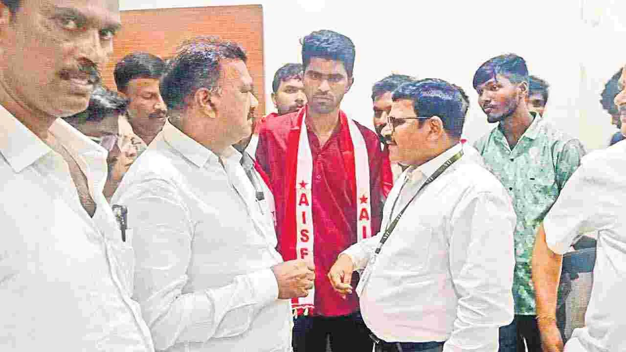 తుళ్లూరు, సెప్టెంబరు 26: అమరావతి రాజధాని ఐనవోలు పరిధిలో ఉన్న వీఐటీ (వేలూరు ఇనిస్టిట్యూట్ ఆఫ్ టెక్నాలజీ) విద్యార్థిని సాయిశ్రీయ ఆత్మహత్య విషయం గురించి తె లుసుకోవడానికి వెళ్లిన తాడికొండ శాసన సభ్యుడు తెనాలి శ్రావణ్ కుమార్కు గురువారం సాయంత్రం చేదు అనుభవం ఎదురైంది. వర్సిటీ సెక్యూరిటీ సిబ్బంది గేటు వద్ద ఆయన్ను అడ్డుకున్నారు. ఎవరైనా సరే లోపలికి వెళ్లడానికి అనుమతుల్లేవని చెప్పడంతో ఎమ్మెల్యే కంగుతిన్నారు. ఎమ్మెల్యేకే లోపలికి వెళ్లడానికి అవకాశం లేదంటే ఇక సామాన్యులు పరిస్థితి ఏమిటని యాజమాన్యంపై శ్రావణ్ కుమార్ ఆగ్రహం వ్యక్తం చేశారు. ఆత్మహత్య చేసుకున్న విద్యార్థిని తల్లిదండ్రులను ఎందుకు లోపలికి అనుమతించడం లేదని ప్రశ్నించారు. అనంతరం వర్సిటీ లోపలికి వెళ్లిన శ్రావణ్ కుమార్ విద్యార్థిని మృతికి గల కారణాలను వైస్ చాన్సలర్ కోటారెడ్డి, రిజిస్ట్రార్ జగదీశ్ ముదిగంటిని అడిగి తెలుసుకున్నారు. మృతి చెందిన విద్యార్థిని తల్లిదండ్రులకు న్యాయం చేస్తామని హామీ ఇచ్చారు.