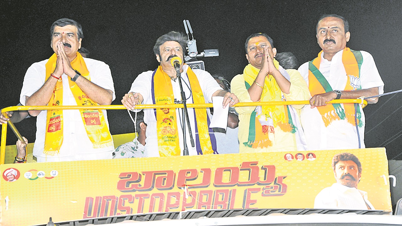 ఎమ్మెల్యే అనంత కుటుంబం ఆరు సార్లు ఎంపీ, ఒకసారి ఎమ్మెల్యేగా పనిచేసిందని, ఇక్కడ ఏం అభివృద్ధి సాధించారని బాలకృష్ణ ప్రశ్నించారు. నగరం అభివృద్ది కావాలంటే కూటమి ఎంపీ అభ్యర్థి అంబికా లక్ష్మీనారాయణ, ఎమ్మెల్యే అభ్యర్థి దగ్గుబాటి వెంకటేశ్వరప్రసాద్ను అత్యధిక మెజార్టీతో గెలిపించాలని ఆయన ప్రజలకు విజ్ఞప్తి చేశారు. కూటమి అధికారంలోకి రాగానే అనంతపురం నగరాన్ని స్మార్ట్సిటీగా మారుస్తామని హామీ ఇచ్చారు. అనంత నగరశివారులోని డంపింగ్ యార్డును వేరే ప్రాంతానికి తరలిస్తామని తెలిపారు. అనంత నగరంలో అండర్ గ్రౌండ్ డ్రైనేజీని ఏర్పాటు చేసేందుకు కూటమి ప్రభుత్వం కృషి చేస్తుందన్నారు. ఈ పరిస్థితుల్లో వైసీపీ ప్రభుత్వాన్ని ఓటుతో మట్టికరిపించాలని ఆయన ప్రజలను కోరారు. కార్యక్రమంలో పెద్ద ఎత్తున టీడీపీ, జనసేన, బీజేపీ నాయకులు, కార్యకర్తలు, బాలకృష్ణ అభిమానులు, ప్రజలు పాల్గొన్నారు.
