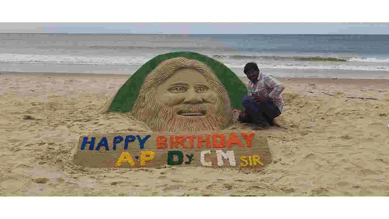 సోమవారం డిప్యూటీ సీఎం పవన్కల్యాణ్ పుట్టినరోజు సందర్భంగా ఆయనకు శుభాకాంక్షలు తెలుపుతూ సైకత శిల్పాన్ని కోట మండలం కొత్తపట్నం పంచాయతీలోని శ్రీనివాససత్రం సముద్రతీరాన ప్రముఖ సైకత శిల్పి, కళాకారుడు మంచాల సనత్కుమార్ ఆదివారం రూపొందించారు.